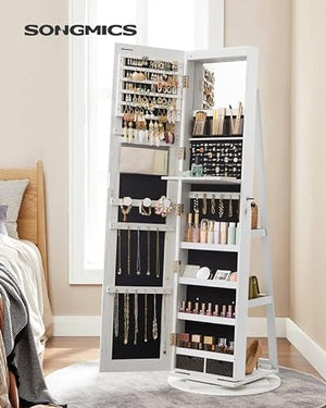 Med 120 slots til øreringe, 54 huller til ørestikkere, 104 slots til ringe, 18 kroge til halskæder, og 3 stænger til armbånd, siger du farvel til rod. Tilføjet med 3 rum, 2 skuffer, 4 hylder og en lomme, sikrer dette skab, at alle dine smykker er organiseret og nemt tilgængelige.