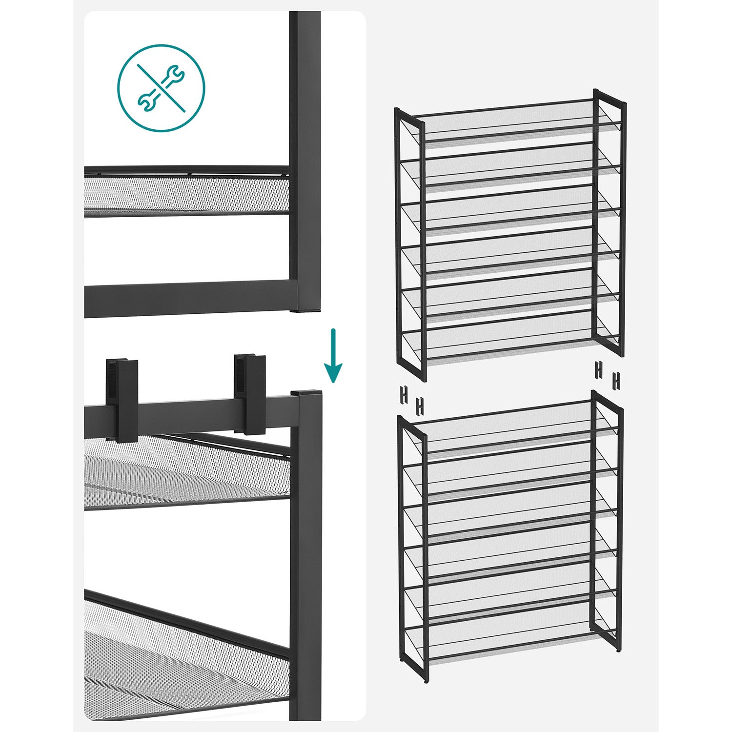 Giv dit hjem en funktionel opgradering med denne alsidige skoreol, der tilbyder 12 justerbare hylder, som du kan konfigurere efter behov. Stak hylderne, adskil dem i to separate 6-hyldereoler eller monter dem fladt eller skråt – mulighederne er mange. Denne skoreol tilpasser sig dine behov og giver dig mulighed for at skabe den perfekte skoopbevaring, der passer til dit rum og din stil.