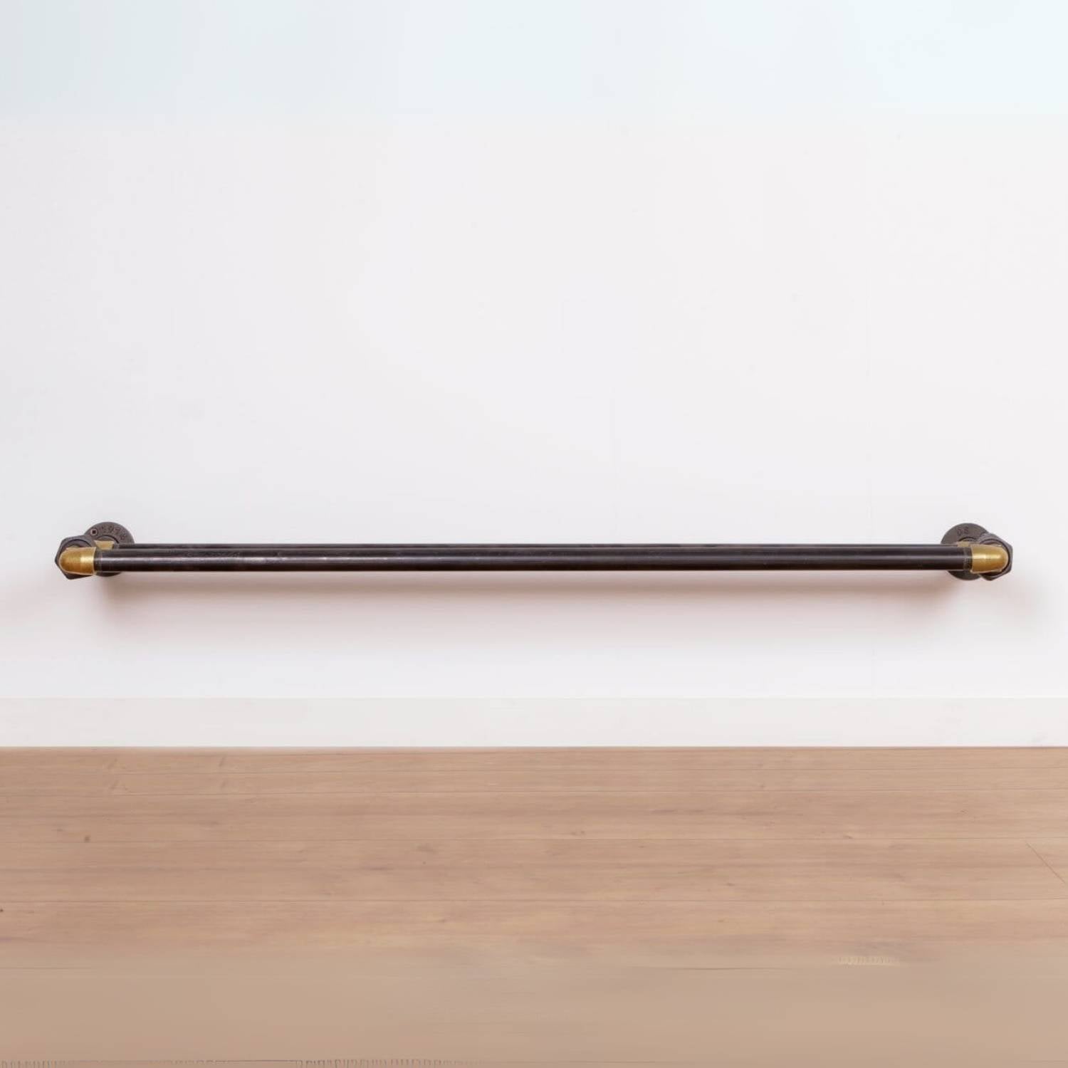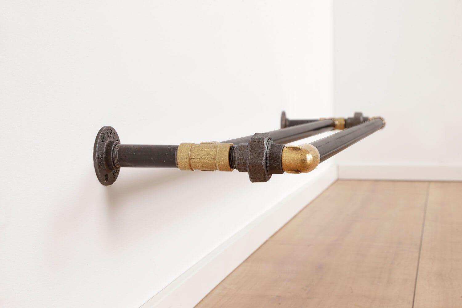 Væghængt skoreol med eksklusivt design i sort med messing vandrør