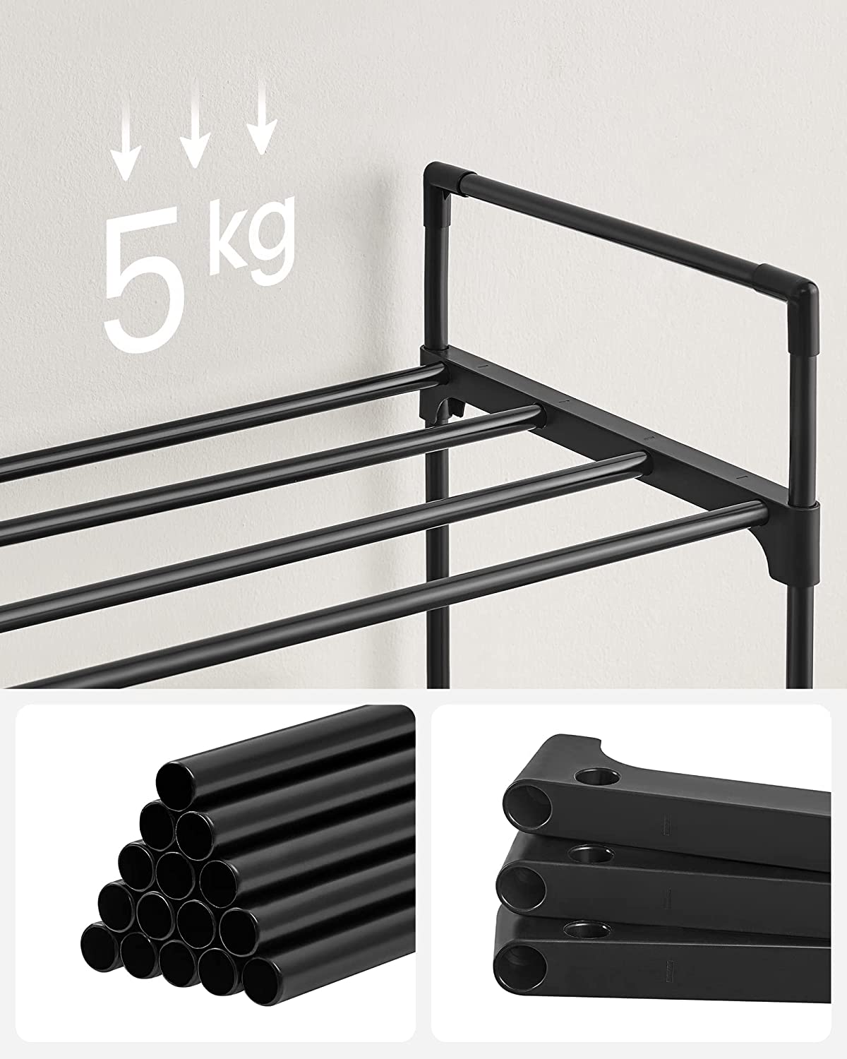Med tykke metalrør og kvalitetsplastforbindelser er denne skohylde bygget til at holde. Hver hylde kan bære op til 5 kg, så du kan opbevare alt fra tunge støvler til lette sneakers med fuld tillid til, at hylden holder. Denne holdbare konstruktion sikrer, at din skoreol vil stå stabilt i årevis, hvilket giver dine sko den stærke støtte, de har brug for.