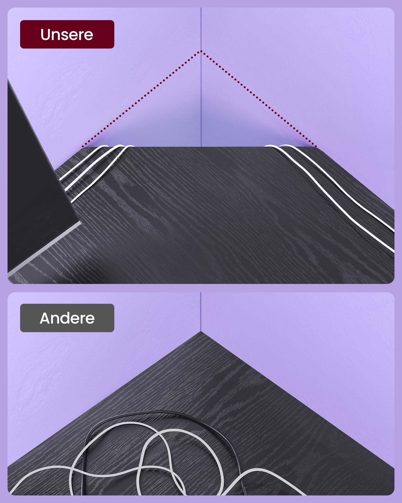 En smart funktion ved dette skrivebord er den afskårne bagkant, der giver mulighed for nem kabelstyring. Dette gør det lettere at organisere dine elektroniske ledninger og holde skrivebordet ryddeligt. Sig farvel til rodet med kabler og nyd et pænt og funktionelt arbejdsområde, hvor alt er på sin plads.