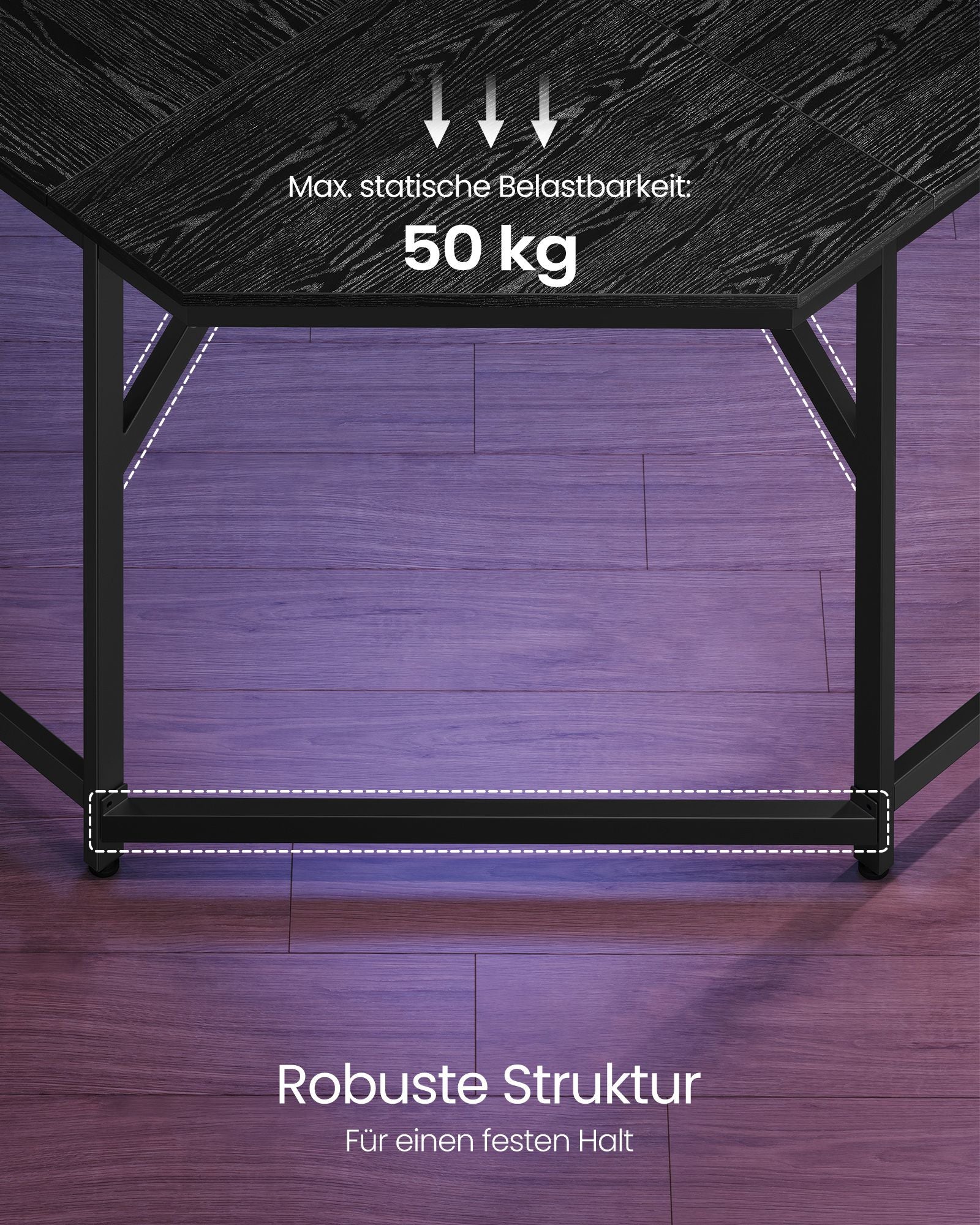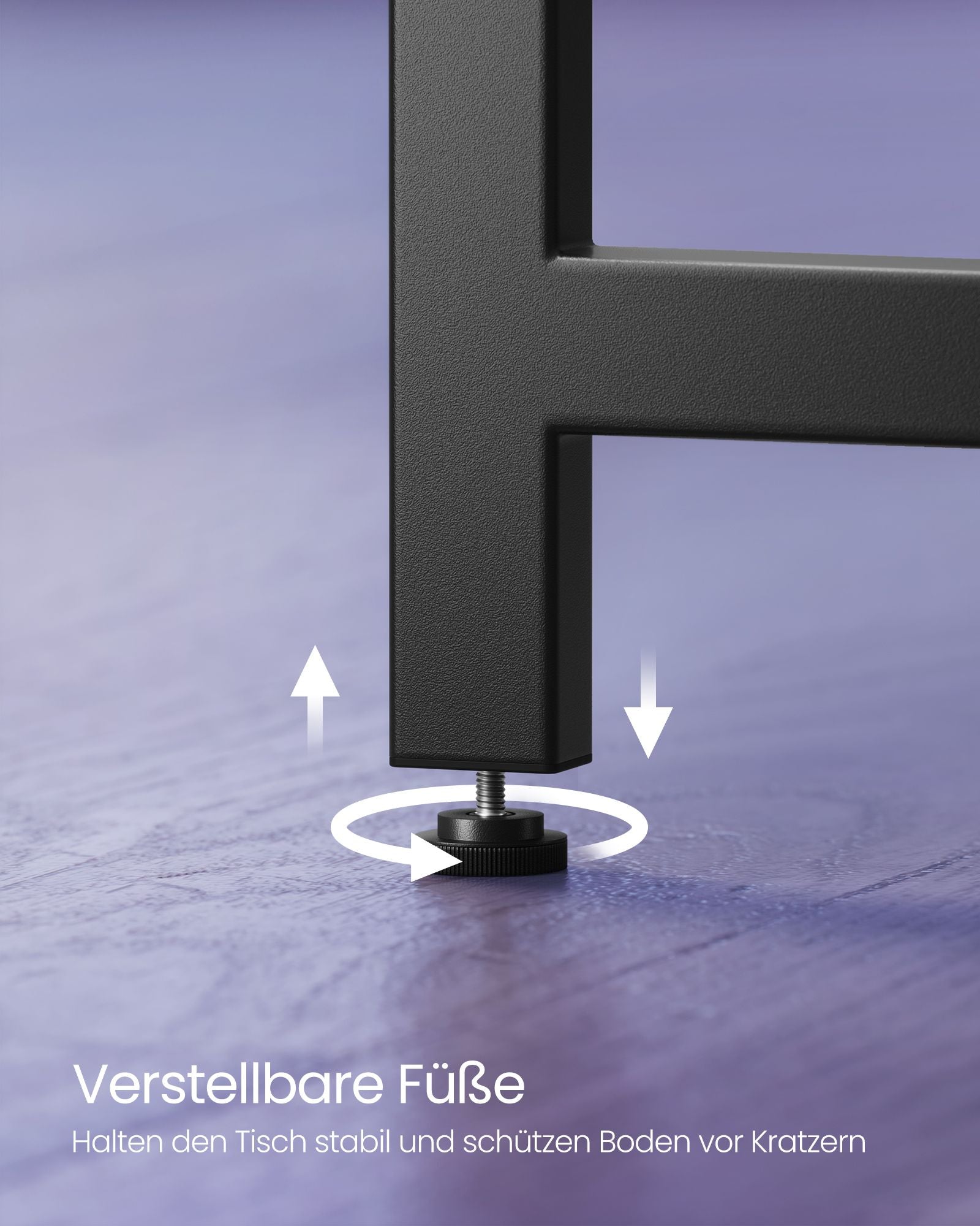 Bygget med stærke spånpladepaneler og en solid stålramme, tilbyder dette skrivebord en robust struktur, der kan understøtte op til 50 kg. De justerbare fødder tilføjer ekstra stabilitet og beskytter dit gulv mod ridser. Dette sikrer, at dit skrivebord står stabilt, uanset hvad du placerer på det, og holder din arbejdsplads fri for skader og skrammer.