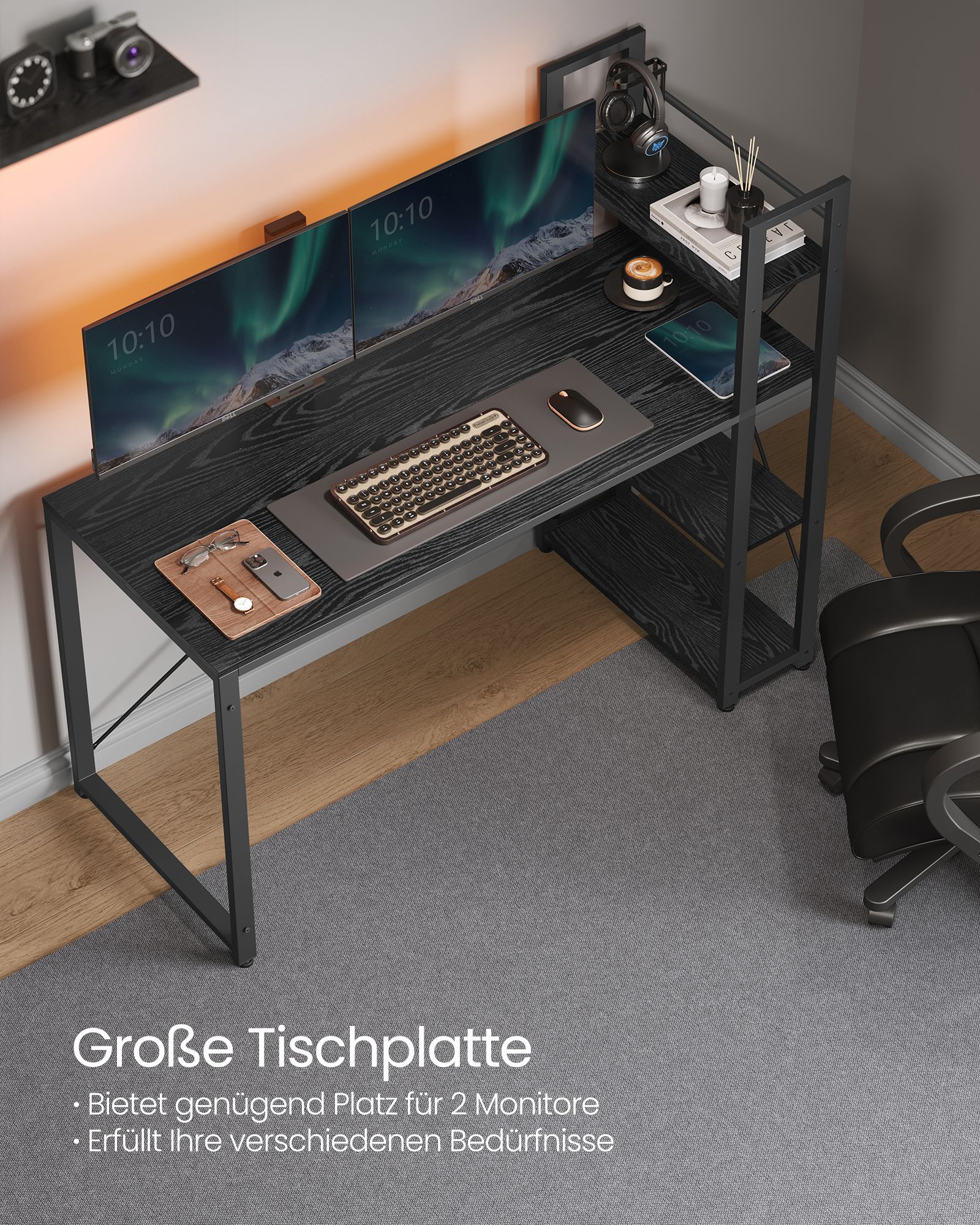 Dette skrivebord har en fleksibelt monteret hylde, som du kan placere til højre eller venstre alt efter dit behov. Denne funktion gør det muligt at tilpasse skrivebordet præcist til din arbejdsplads og sikrer, at du har optimal adgang til alle dine nødvendige materialer. Uanset om du arbejder hjemmefra eller har brug for et sted til dine gaming-udstyr, vil denne hylde være en værdifuld tilføjelse.
