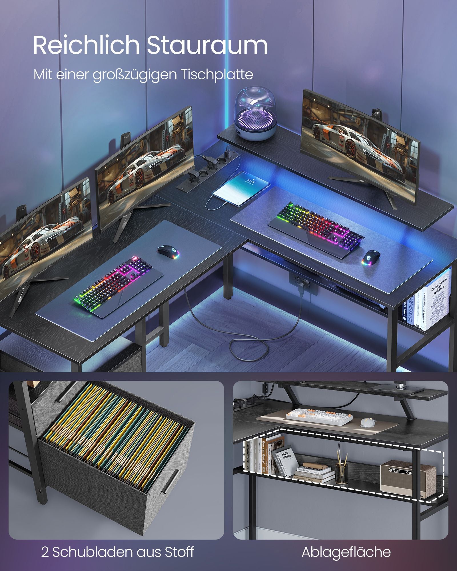 Dette L-formede skrivebord er skabt til at tilpasse sig dine behov. Med dets reversibel design kan du installere skufferne på enten venstre eller højre side, hvilket gør det ideelt til skrivning, studier eller gaming. Denne fleksibilitet sikrer, at du kan tilpasse skrivebordet til den mest komfortable og funktionelle konfiguration for dit arbejdsområde eller din spillezone.