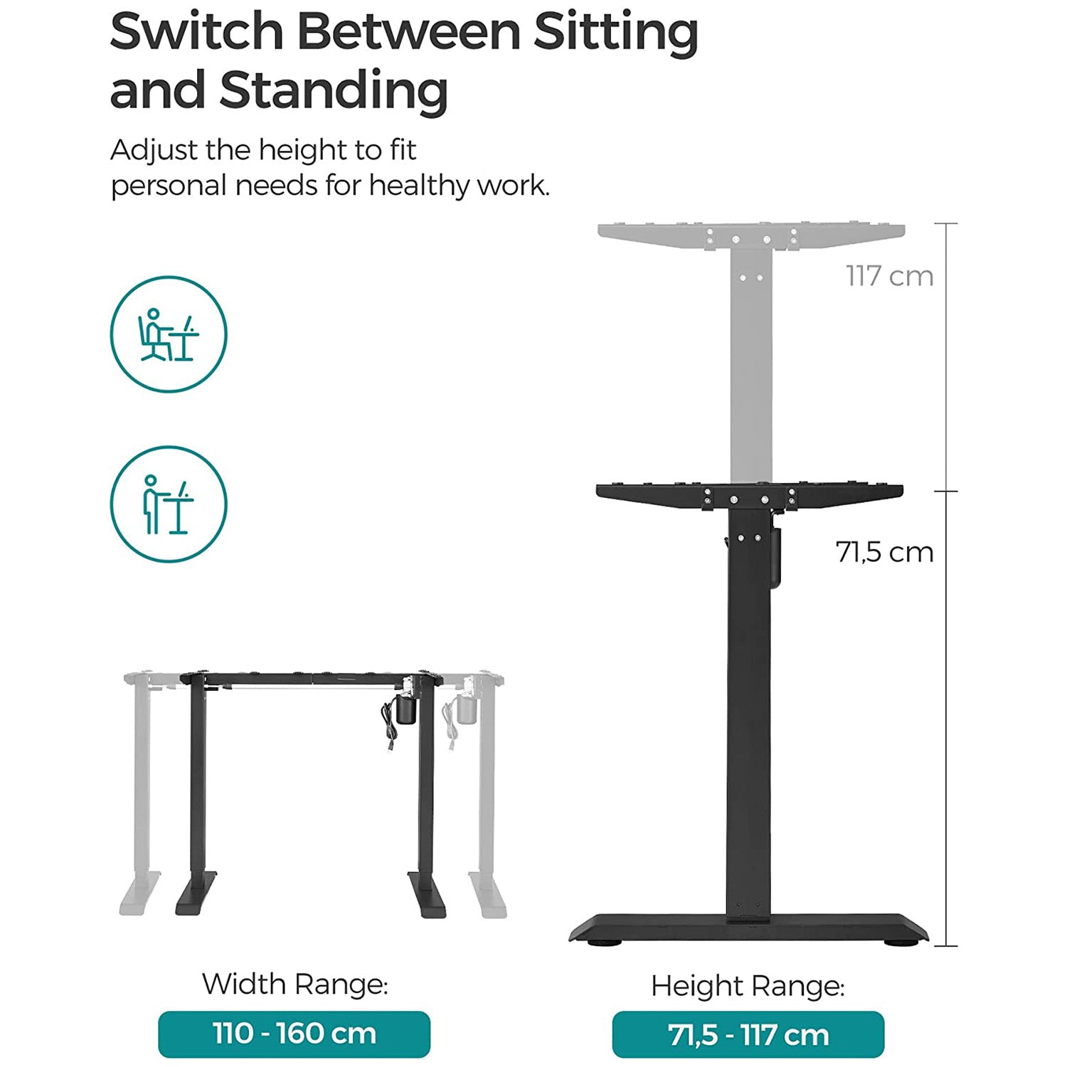 Vores skrivebords stel er designet med fleksibilitet i tankerne. Med en justerbar højde fra 73 til 118 cm er dette stel ideelt for personer mellem 1,1 og 1,95 meter høje. Uanset om du ønsker at sidde eller stå, kan du finde din ideelle arbejdsstilling for at forbedre din komfort og produktivitet. Det giver dig mulighed for at skifte mellem siddende og stående arbejdspositioner, hvilket er perfekt for at lindre kroppens belastning og optimere din arbejdseffektivitet.