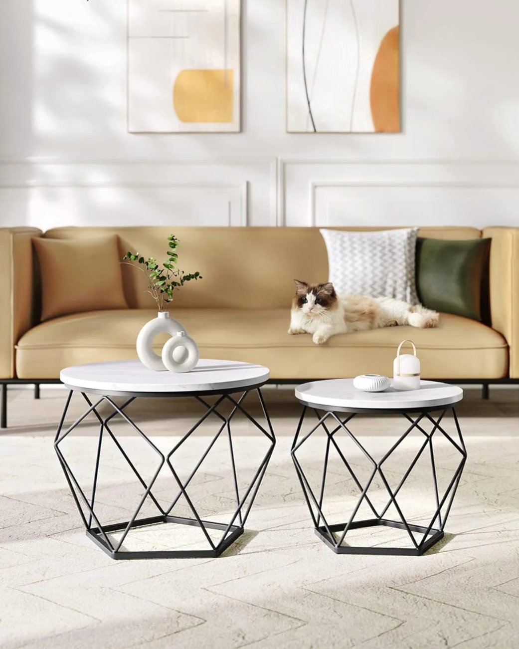 Med deres runde hvide toppe og geometriske sorte stålbaser tilfører disse sofaborde et moderne og stilfuldt præg til din boligindretning. Deres attraktive udseende vil uden tvivl imponere dine gæster og tilføje et elegant touch til dit hjem. Perfekte til enhver moderne indretning, der søger både funktionalitet og æstetik.