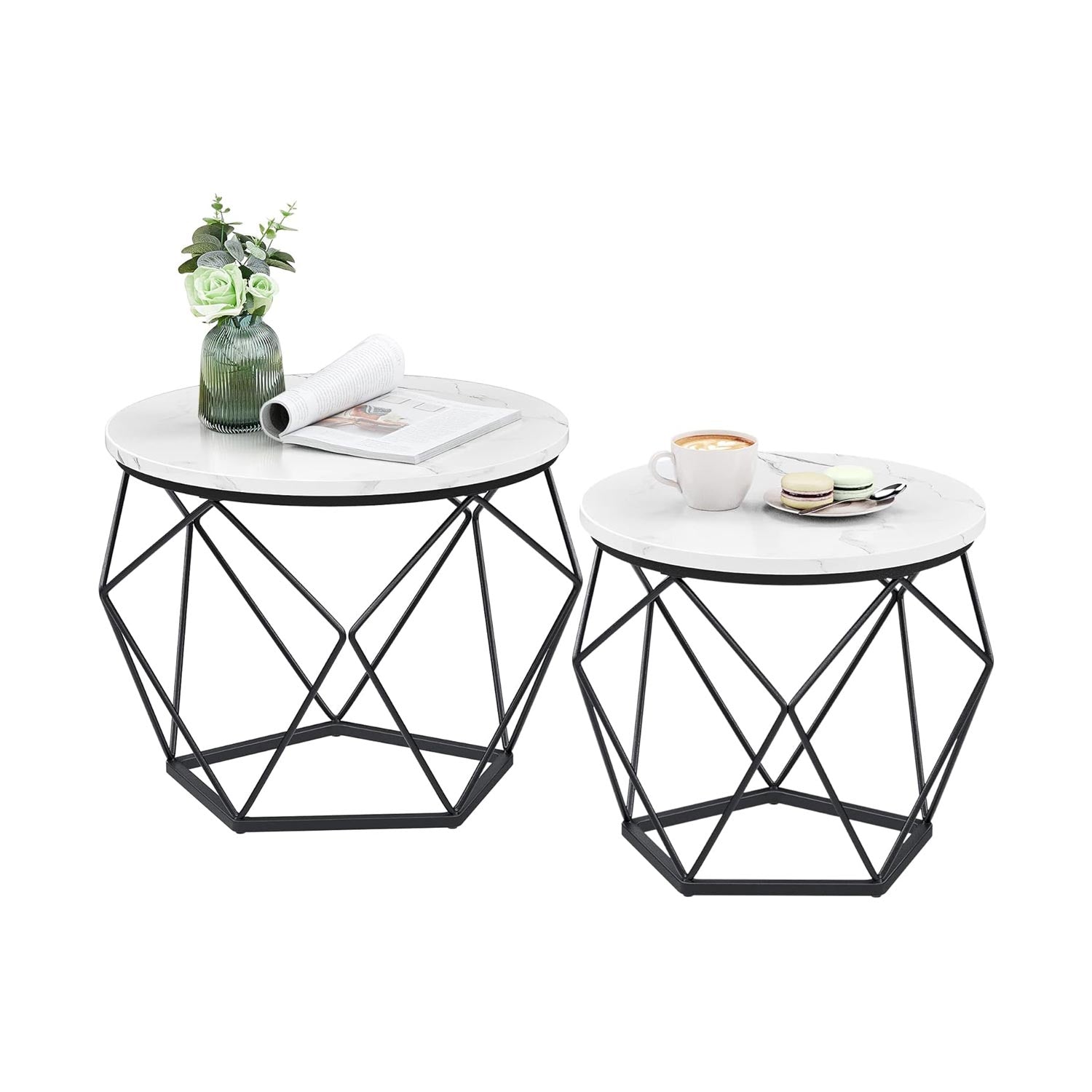 Sættet er fremstillet af kvalitets partikelboard og en robust stålramme, hvilket sikrer stabilitet og holdbarhed. Hvert lille bord kan bære op til 20 kg, hvilket betyder, at du kan placere dine kaffe- og te-kopper samt dekorationer uden risiko for vuggen. Denne stærke konstruktion gør, at bordene forbliver stabile og funktionelle i mange år fremover.
