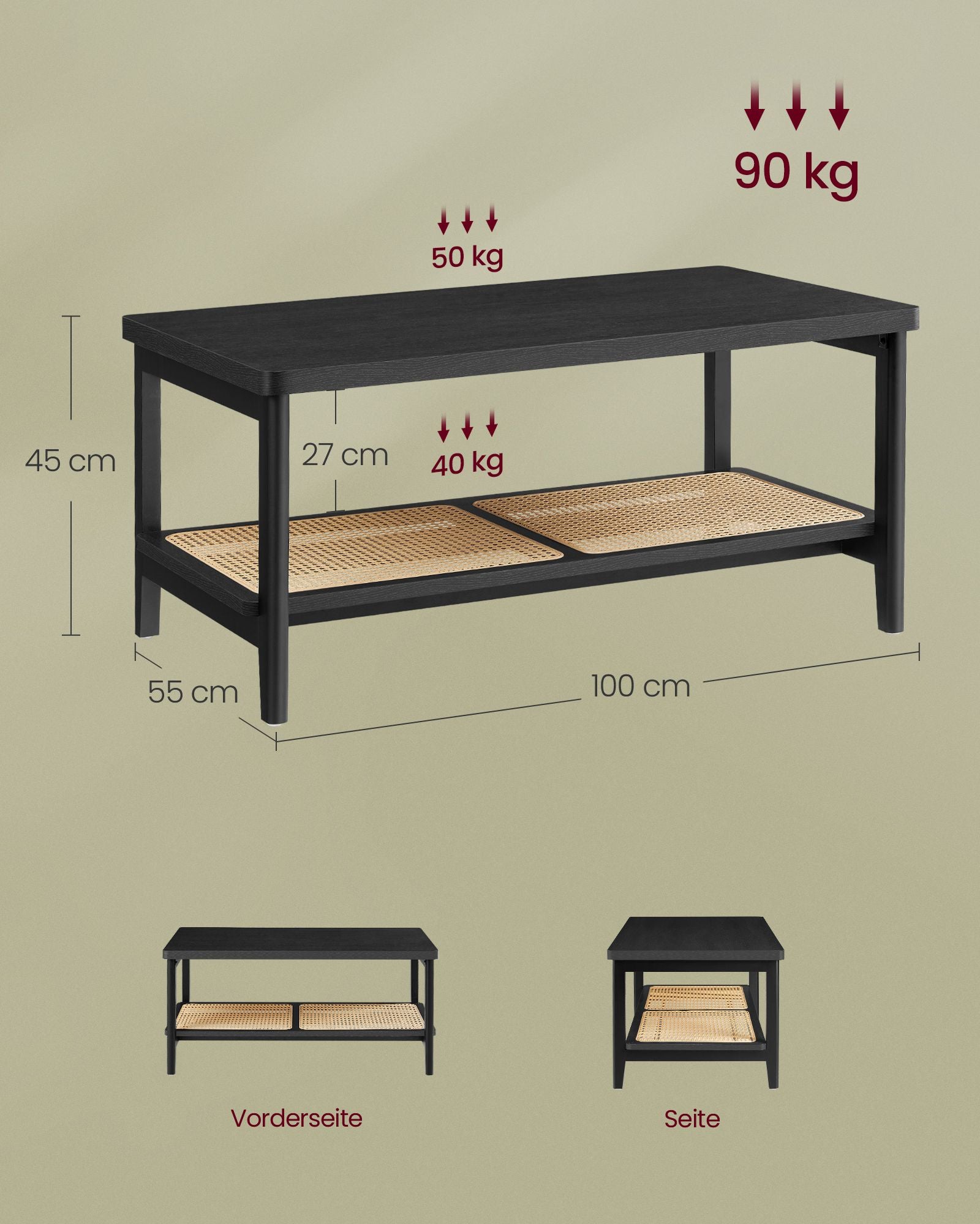 Sofabordet er designet til at være både holdbart og funktionelt. Med en MDF bordplade, der kan bære op til 50 kg, og en plast rattan hylde med en maksimal belastning på 40 kg, er dette bord ideelt til opbevaring af bøger, dekorationer og meget mere. Det stærke materiale sikrer, at bordet forbliver stabilt og pålideligt i mange år.