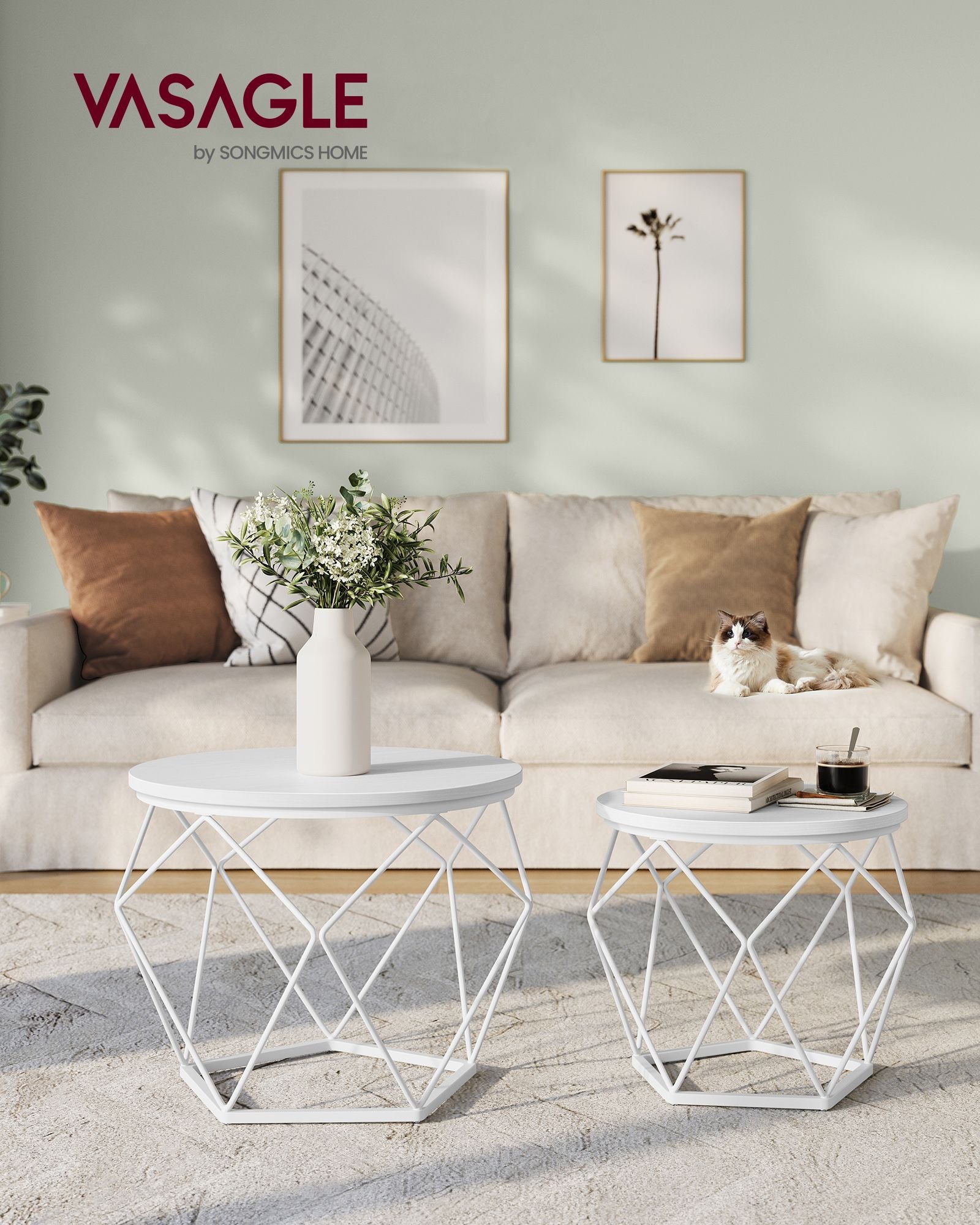 Med deres runde sne-hvide toppe og geometriske hvide stålbaser, tilfører disse sofaborde et strejf af moderne elegance til din boligindretning. Deres stilfulde udseende vil tiltrække beundring fra dine gæster og løfte rummets atmosfære.
