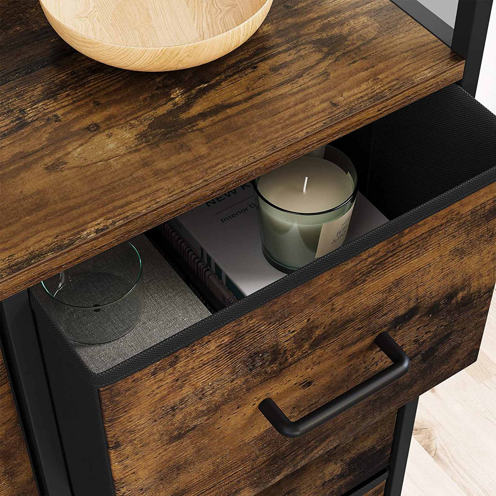 Industrien er på vej: Bring et strejf af industriel modernitet ind i ethvert rum med denne renoverede Frankfurt kommode. Med sine rustikke brune skuffer og sorte metalramme vil den skabe en udsøgt atmosfære, som dine gæster helt sikkert vil beundre.
