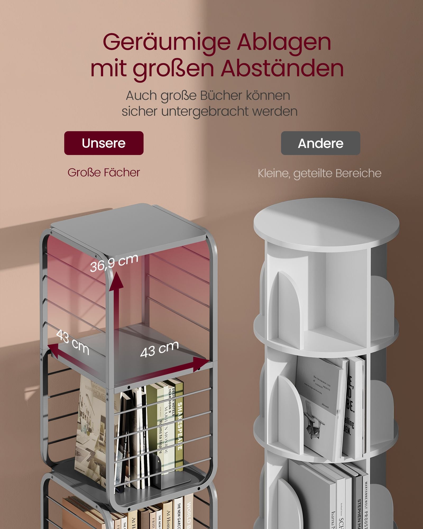 Med dimensioner på 43 x 43 x 158 cm er denne reol designet til at maksimere opbevaringspladsen uden at fylde meget på gulvet. Den justerbare hylde giver dig fleksibiliteten til at opbevare genstande af forskellige størrelser, hvilket gør den perfekt til alt fra bøger og dekorationer til sengetøj og tøj.