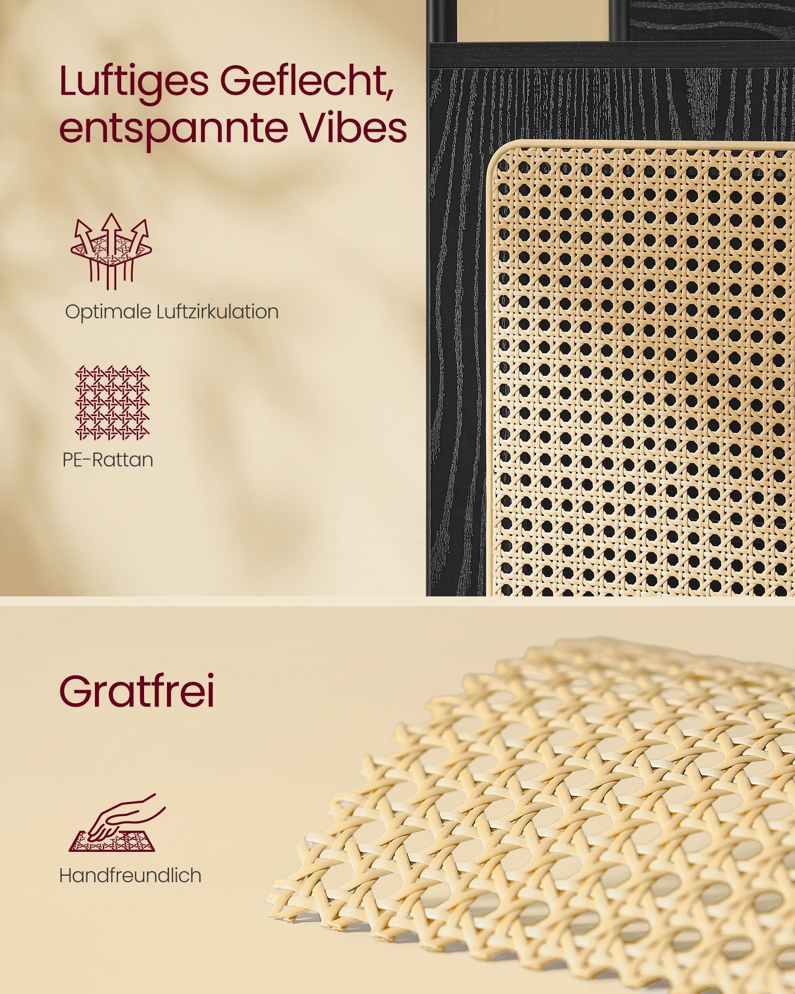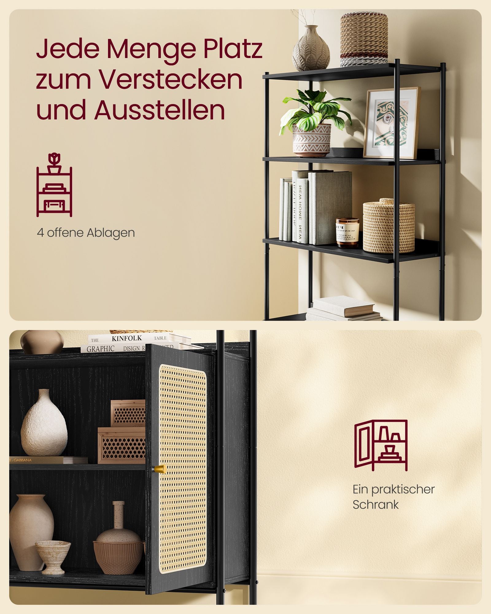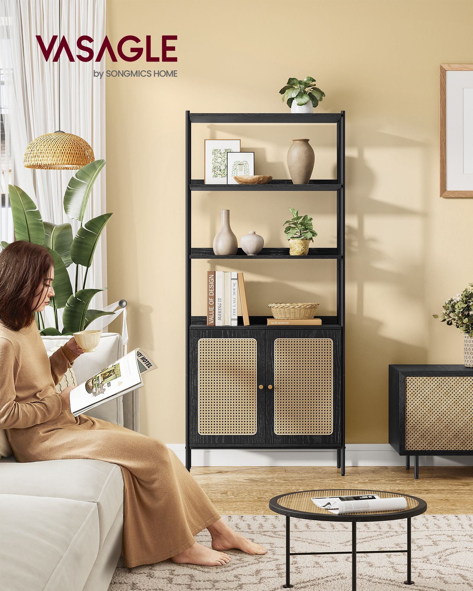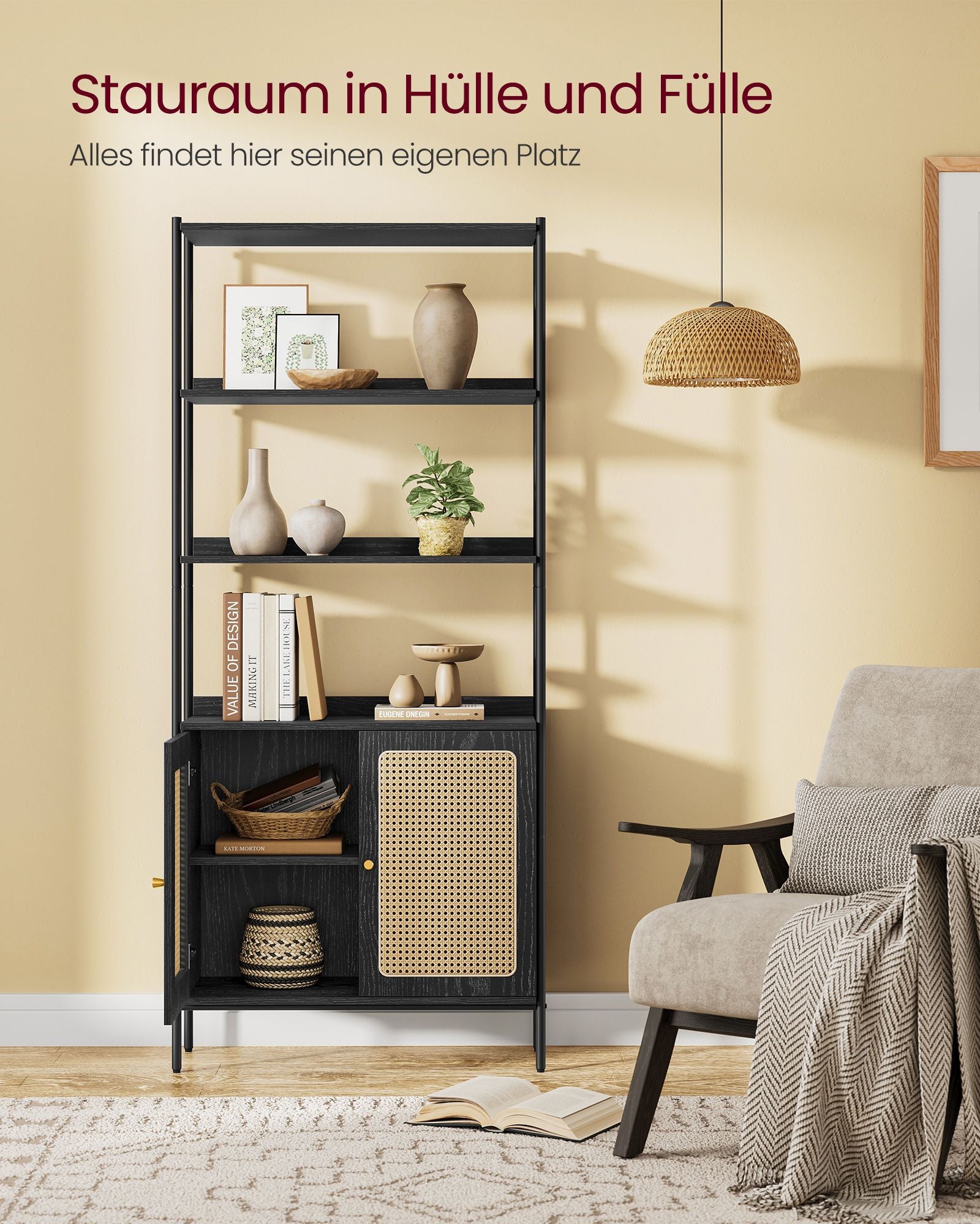 Giv dit hjem en hyggelig og afslappet atmosfære med denne boho-inspirerede reol. Den rolige sorte farve kombineret med rattan-lignende skabslåger skaber en luftigt og afslappet stemning, som løfter ethvert moderne rum. Denne reol er ideel til dig, der ønsker at tilføre dit hjem en varm og indbydende stemning med et strejf af boho charme.