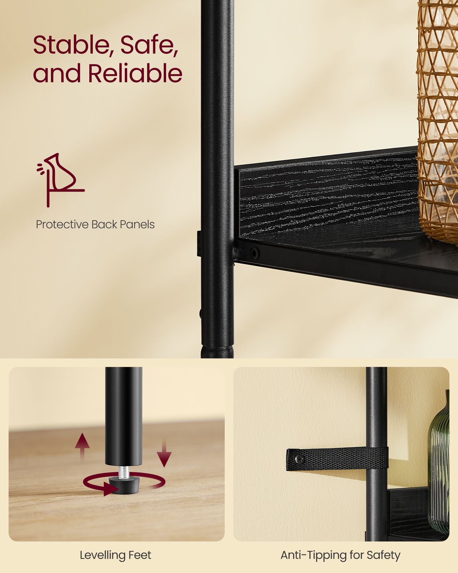 Denne reol er ikke blot elegant, men også robust og sikker. De justerbare fødder sikrer, at den står stabilt, selv på ujævne gulve, og det medfølgende anti-tip kit gør det muligt at fastgøre reolen til væggen for ekstra sikkerhed. Bagpanelerne forhindrer desuden, at dine ting glider ud, så du kan opbevare dine ejendele sikkert og organiseret.