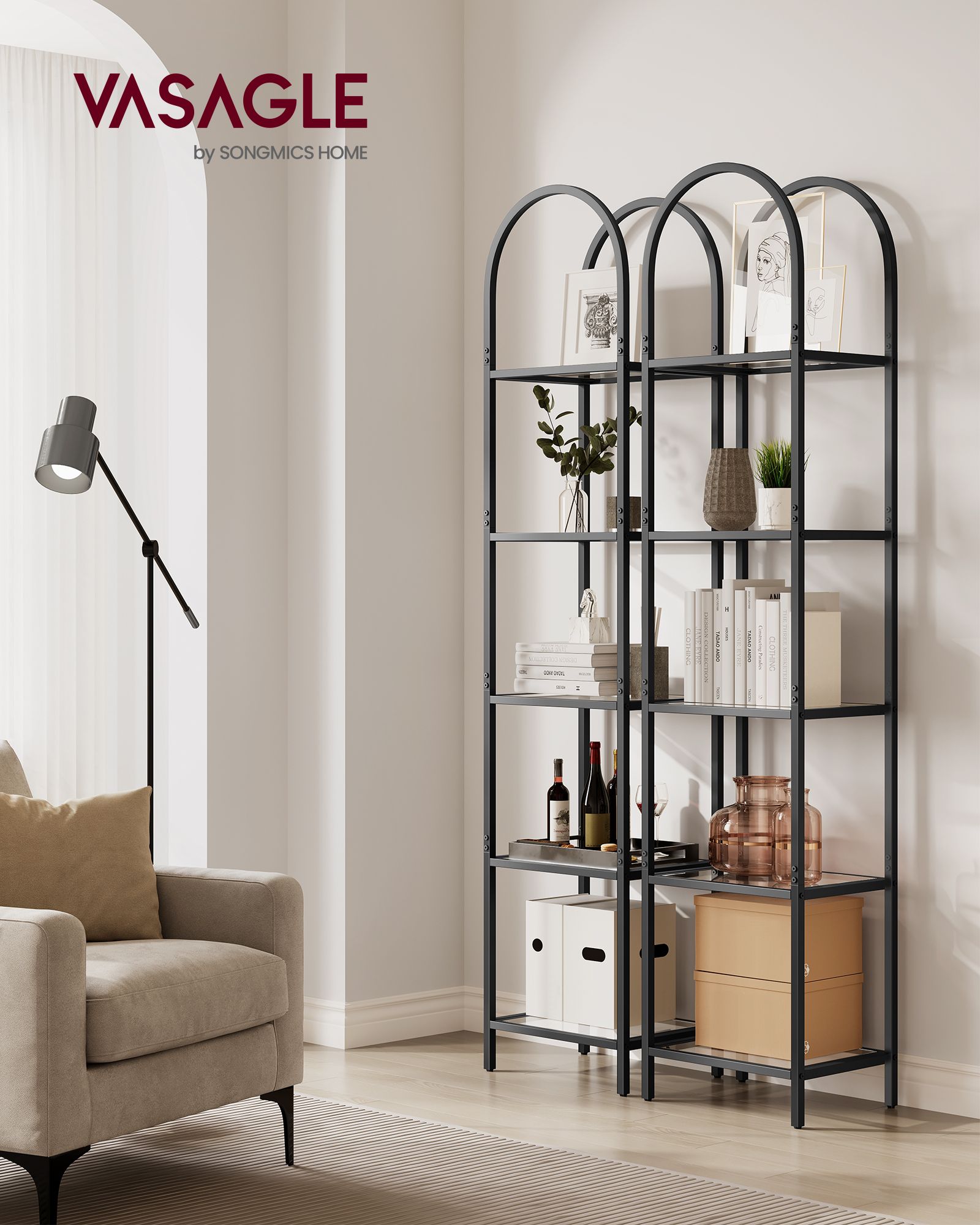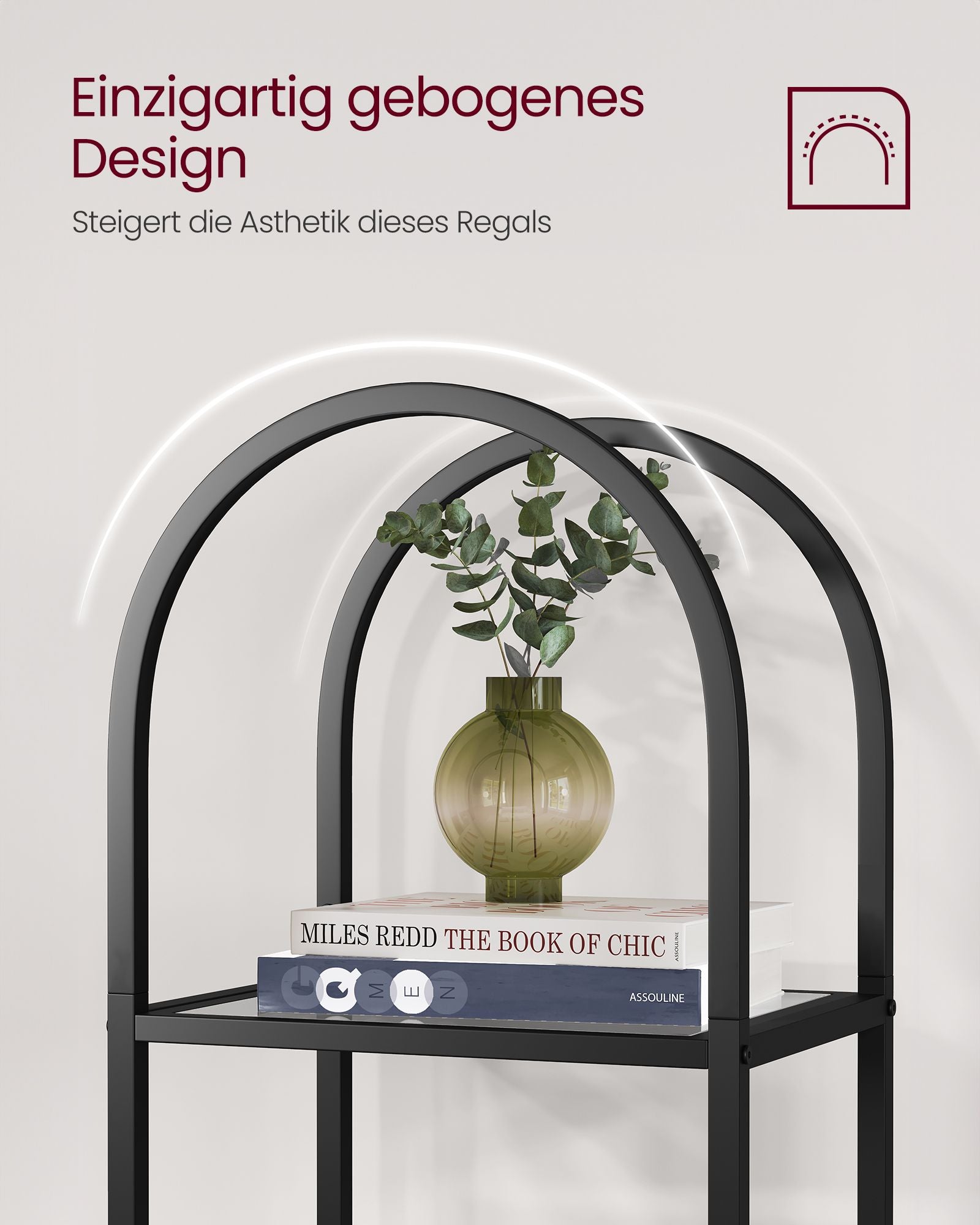 Denne buede reol med skifergrå glas og sort stålramme skaber et sofistikeret look til dit hjem. Perfekt til at fremvise dine yndlingsting i stuen, soveværelset eller kontoret.