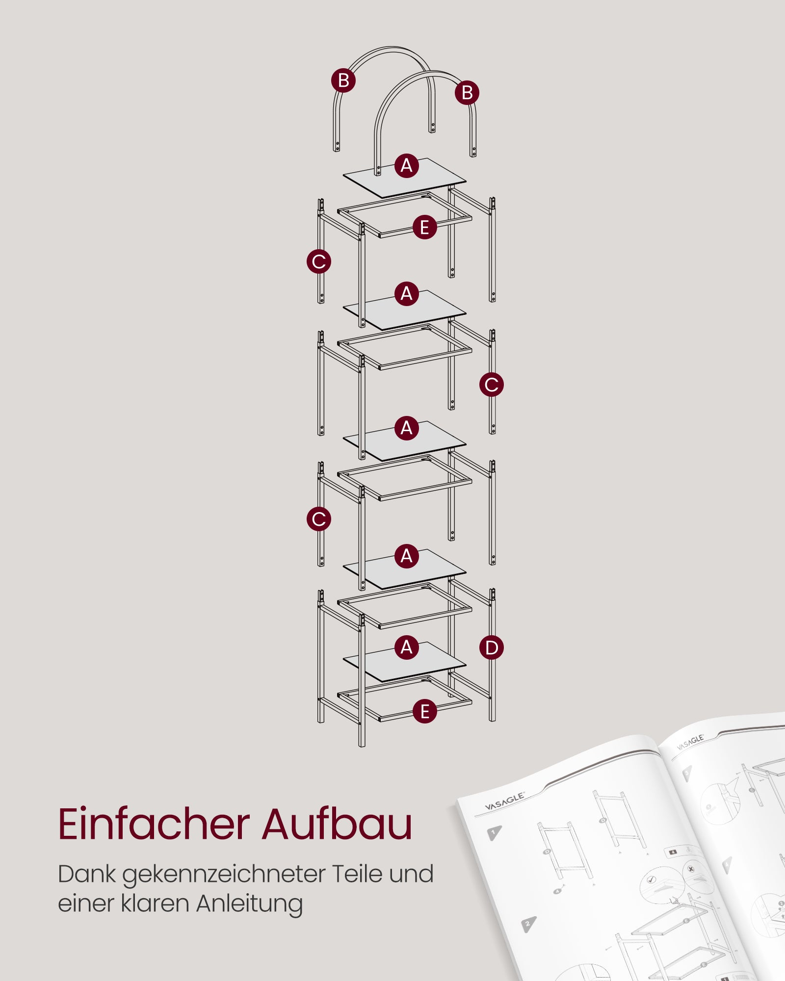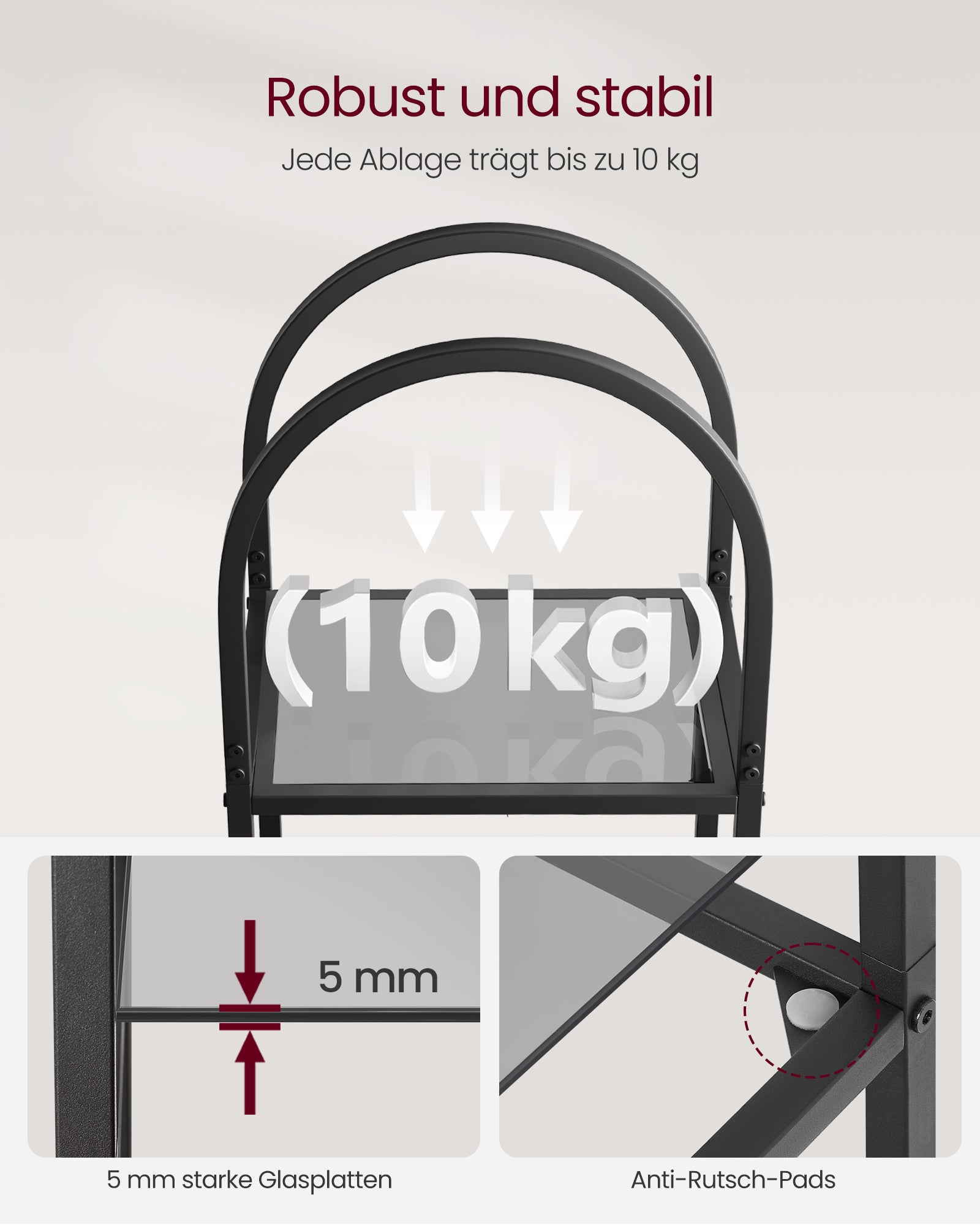 Med 5 mm hærdet glas og skridsikre pads kan hver hylde bære op til 10 kg. Justerbare fødder og anti-tip sikring giver ekstra stabilitet og sikkerhed.