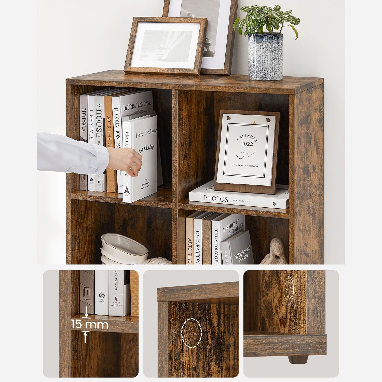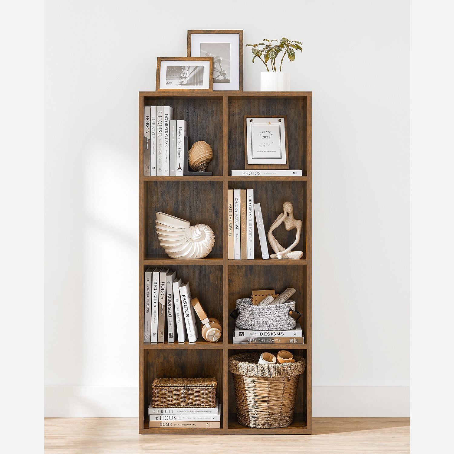 Denne reol i vintage brun med 4 hylder og 8 åbne rum tilføjer rustik charme til hjemmet og giver plads til bøger, dekorationer og DVD'er. En perfekt opbevaringsløsning til stuen, soveværelset eller kontoret.