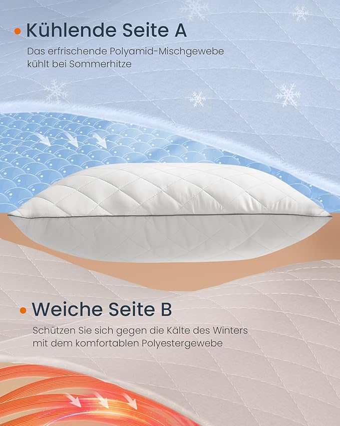 Denne vendbare pude er skabt til at give dig den bedste komfort uanset årstiden. Den ene side af puden har et kølende stof, der holder dig frisk i sommervarmen, mens den anden side er lavet af blødt og hyggeligt polyester, der holder dig varm om vinteren. Uanset om temperaturen stiger eller falder, sikrer denne pude, at du altid sover komfortabelt.