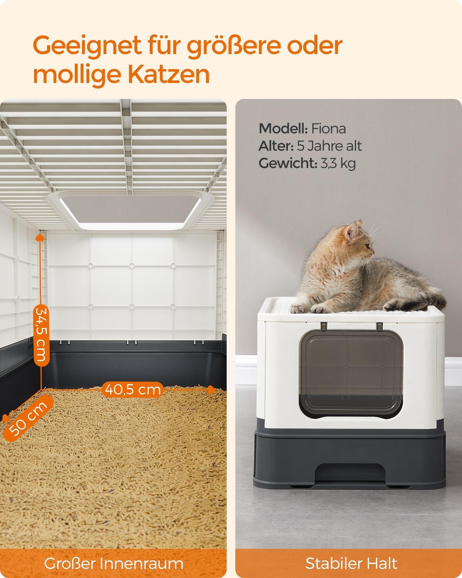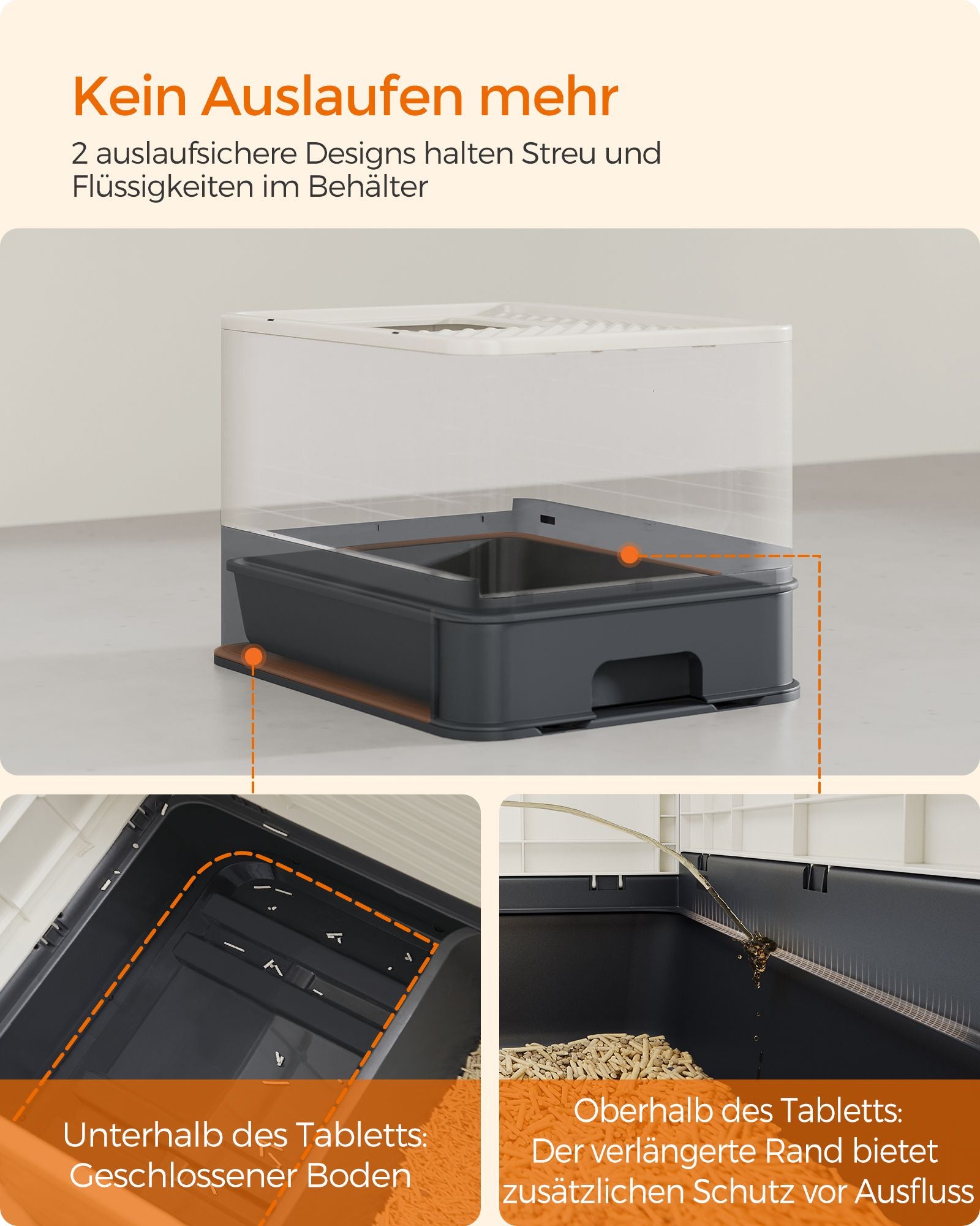 Med lister og en lukket bund forhindrer denne kattebakke, at grus eller urin lækker ud på gulvet. Dette er især nyttigt, hvis din kat har tendens til at grave eller tisse stående. Kattebakken er også rummelig nok til selv de mest fyldige katte, og den solide top kan bære op til 15 kg, hvilket gør den ideel til katte i alle størrelser.