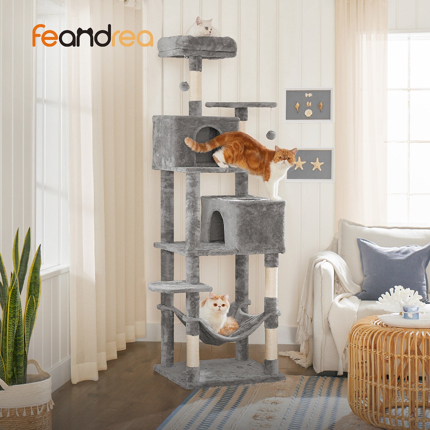 Dette kradsetræ er designet til at tilbyde dine katte komfort fra morgen til aften. De kan tage et solbad i den bløde hængekøje, strække sig på den polstrede topplatform, eller krølle sig sammen i den rummelige kattehule for en god nats søvn. Uanset hvad, vil din kat hurtigt finde sine yndlingssteder på dette alsidige kradsetræ.