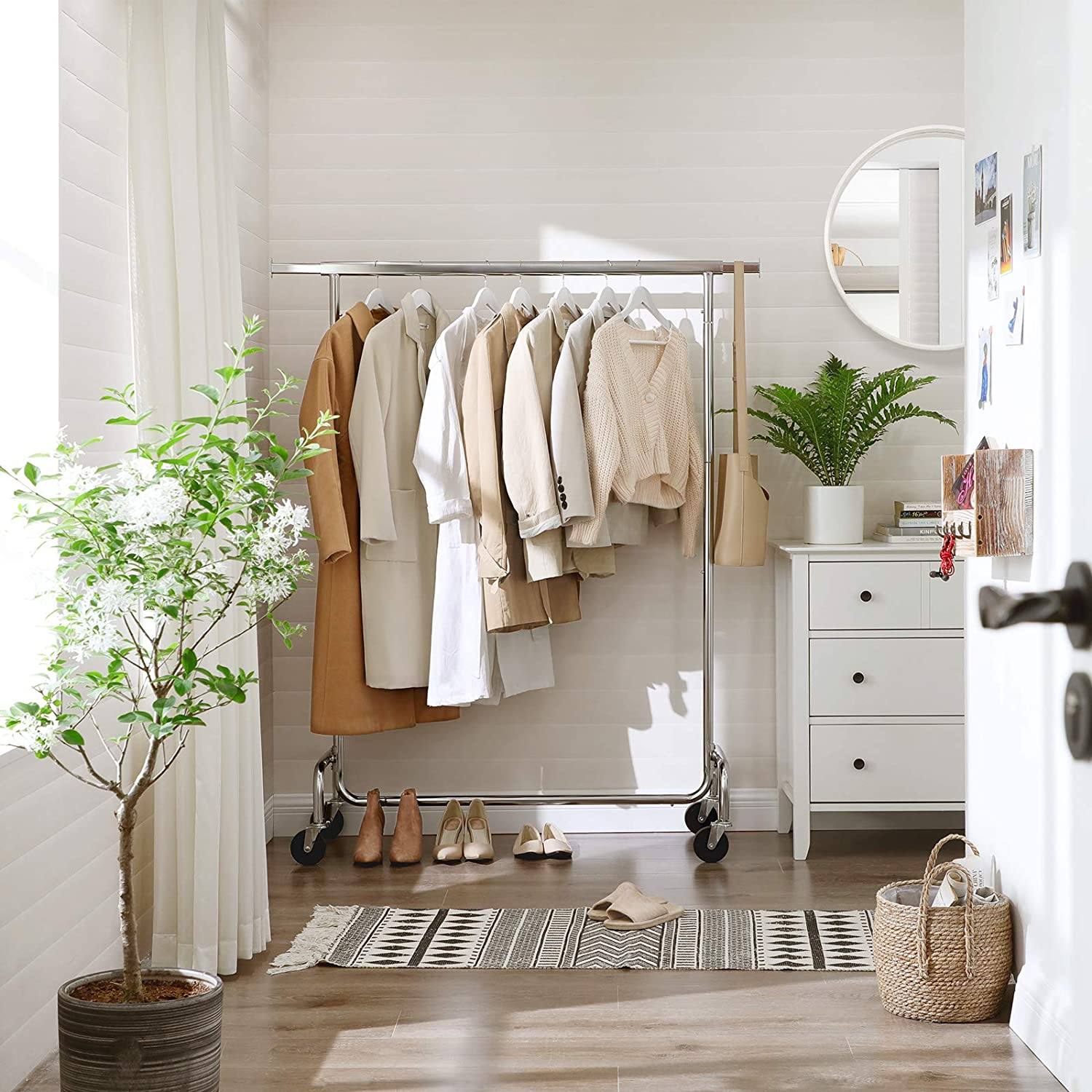 Er der for meget tøj i dit skab, som bare aldrig synes at passe? Ikke længere! Dette alsidige tøjstativ kan udvides fra 110 cm til 150 cm i bredden og kan holde op til 130 kg. Det er plads nok til ethvert klædeskab. Og det bedste er? Den leveres på hjul med stop, så du nemt kan flytte den rundt, hvis du vælger at flytte den i dit hjem. Du behøver ikke længere løfte de tunge skuffer for at finde et outfit - alt er altid godt organiseret på ét sted!