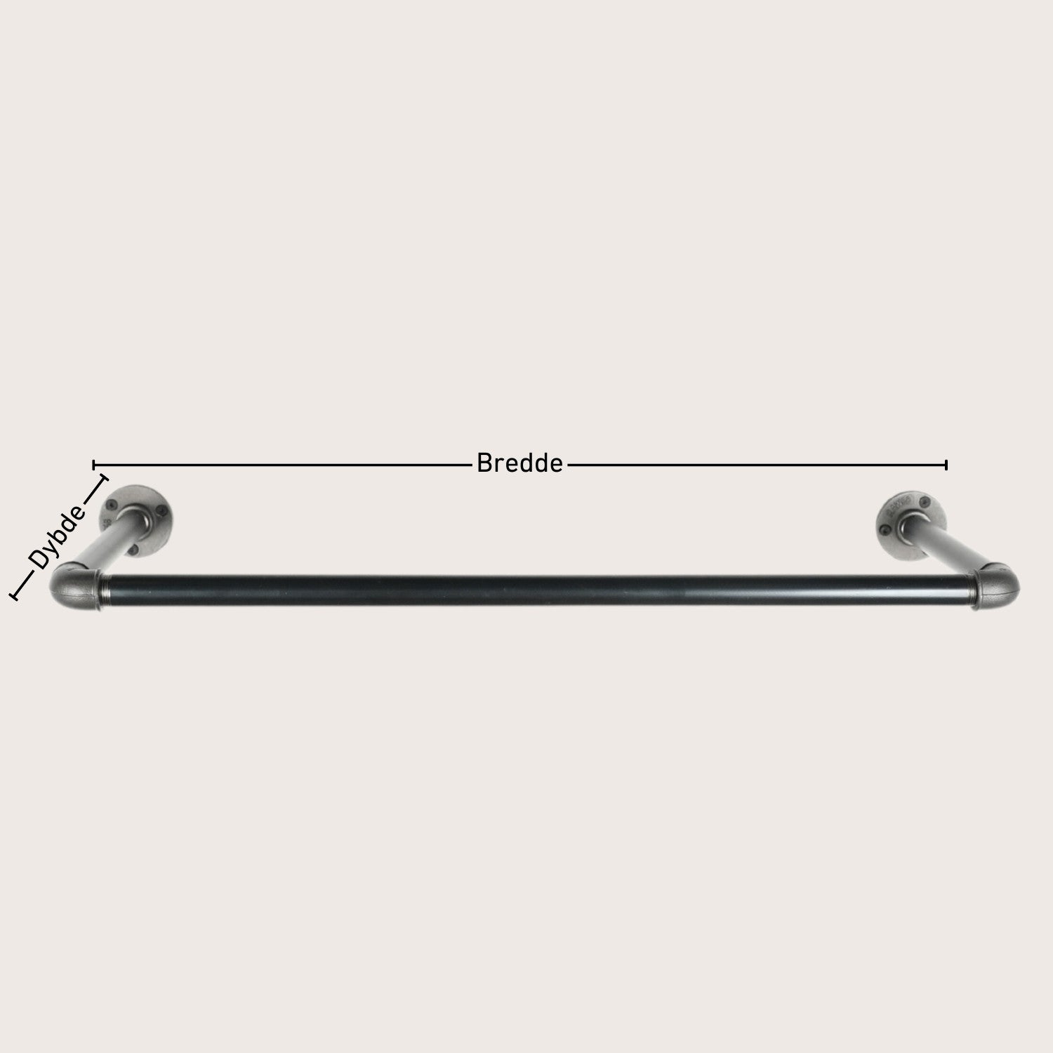 Bredde og dybde målet der er oplyst er de komplette mål på hele ophænget fra ende til ende inkl. de runde beslag. Selve bøjlestangen er cirka 12 cm kortere end ophængets komplette bredde.