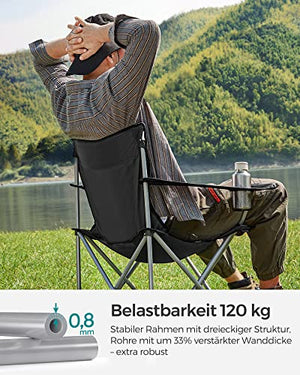 Konstrueret med en stålramme med en vægstykkelse på 0,8 mm og klædt i slidstærkt 600D Oxford-stof med vandafvisende overflade, er disse campingstole bygget til at holde. De kan støtte en vægt på op til 120 kg, hvilket sikrer en pålidelig og sikker siddeoplevelse. Sædets dimensioner på 42 x 40 cm (D x B), en ryghøjde på 48 cm, og en siddehøjde på 43 cm er nøje udvalgt for at sikre optimal komfort. Nyd hver eneste udendørs øjeblik med den ergonomiske design, der lover afslapning og komfort.