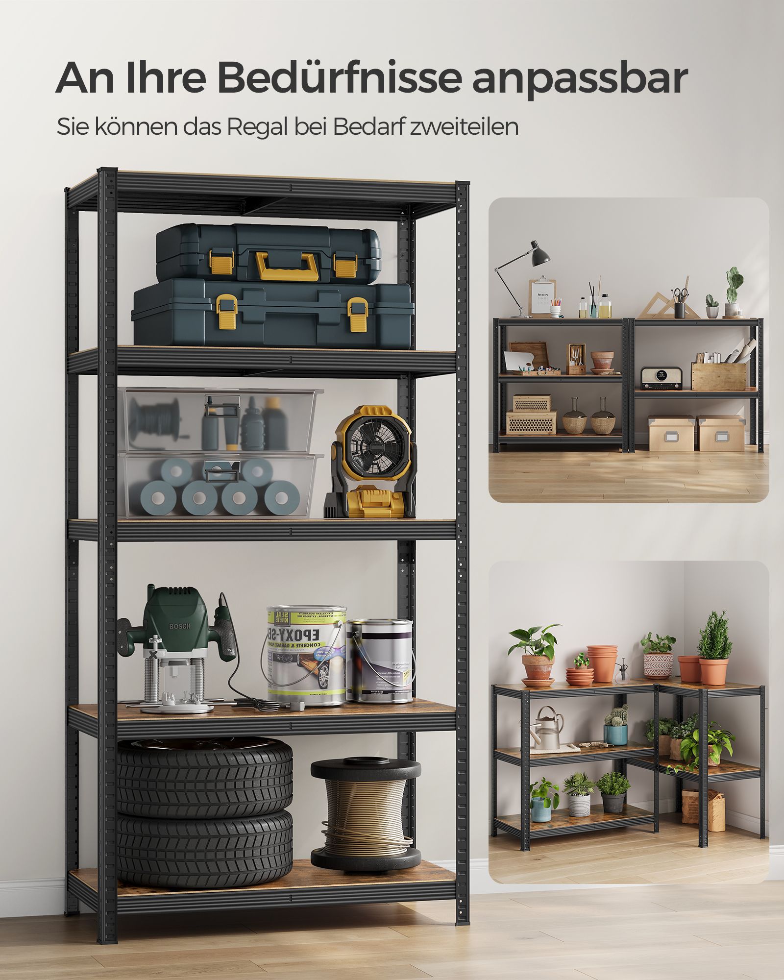 Denne værkstedsreol har robuste hylder af spånplade, der understøttes af en stålramme med ekstra forstærkningsstænger. Hver hylde kan bære op til 150 kg, hvilket gør den ideel til at sikre opbevaring af maling, værktøj og fitnessudstyr.