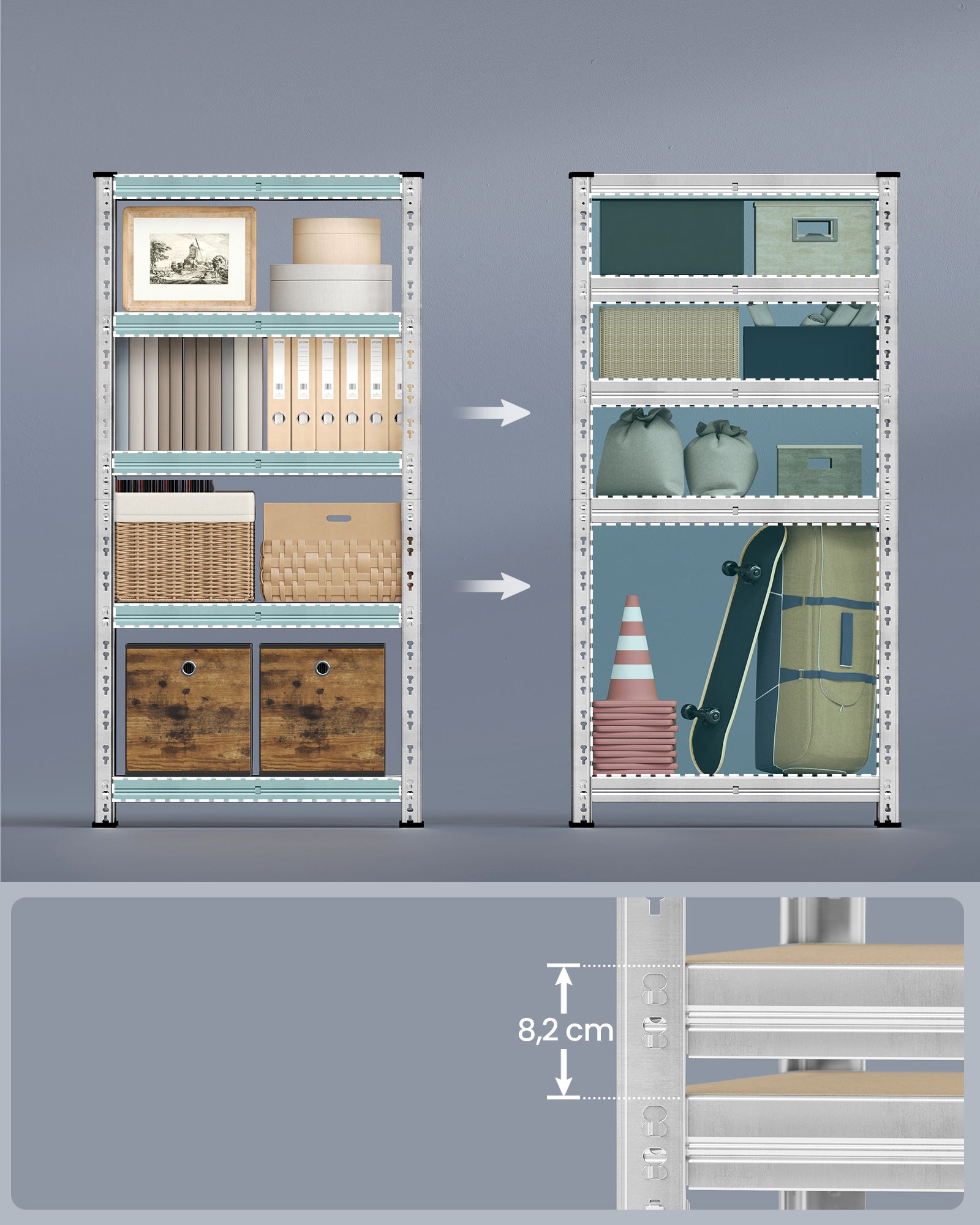 Hylderne kan justeres i trin på 8,2 cm, så du kan tilpasse pladsen til både opbevaringskasser, værktøj og sportsudstyr.