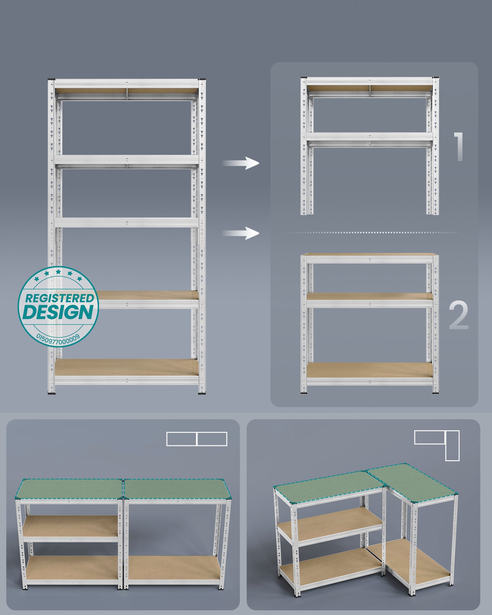 Hver værkstedsreol kan opdeles i 2 mindre enheder, så du kan opstille dem side om side, i en L-form eller placere dem i forskellige rum.