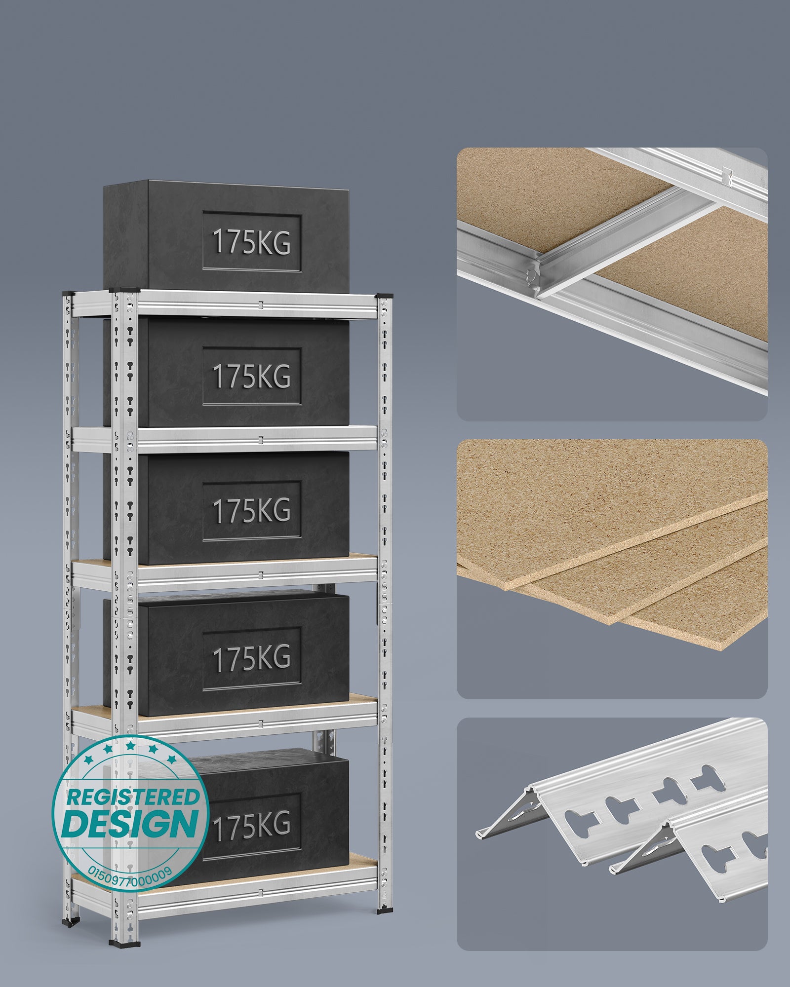 Den robuste stålramme, tykke MDF-hylder og forstærkede tværbjælker giver en imponerende bæreevne på op til 175 kg pr. hylde samt høj stabilitet.