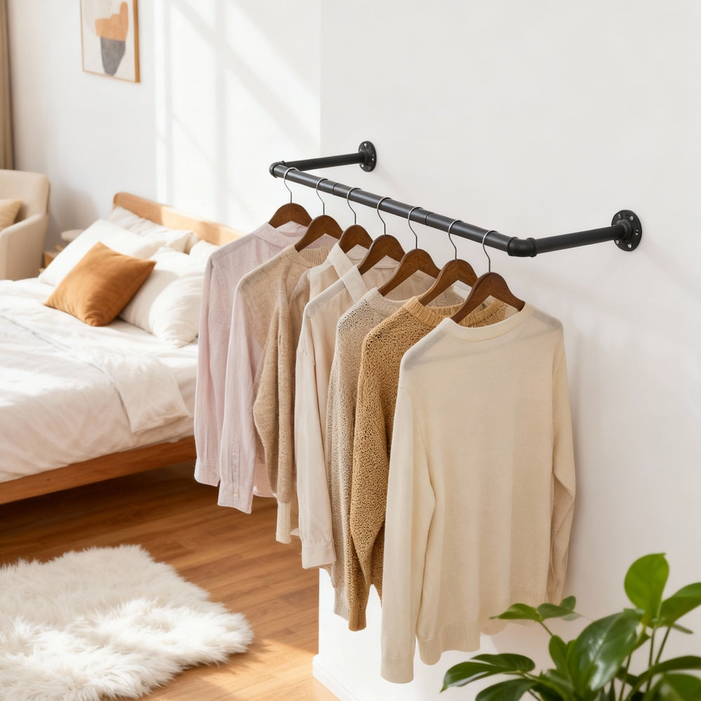 Trendy Small Room Addition: Is your wardrobe bursting at the seams? Need another spot for hanging your jackets? These wall-mounted clothes rails come to the rescue. With pipe frames and black colour, they also lend an industrial appeal