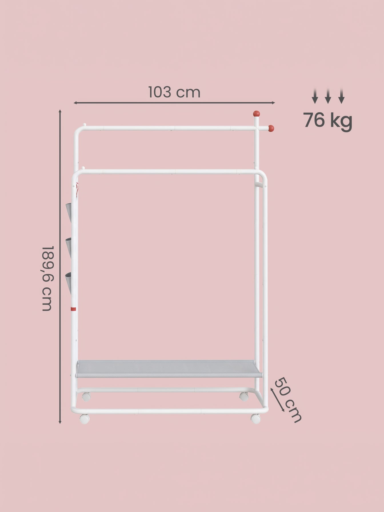 Tøjstativet er fremstillet i stål og har 2 tøjstænger med en kapacitet på op til 30 kg pr. stang. Derudover får du en praktisk hylde til sko eller kasser samt en sidelomme med 3 rum til småting.
