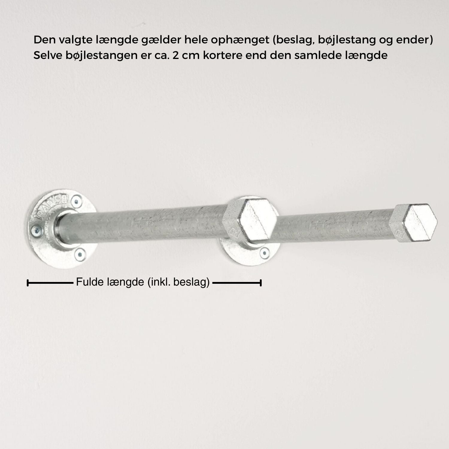| Bemærk: Den samlede længde du vælger er hele ophænget inkl. enden og beslag. Bøjlestangen er ca. 2 cm kortere end den samlede længde. |