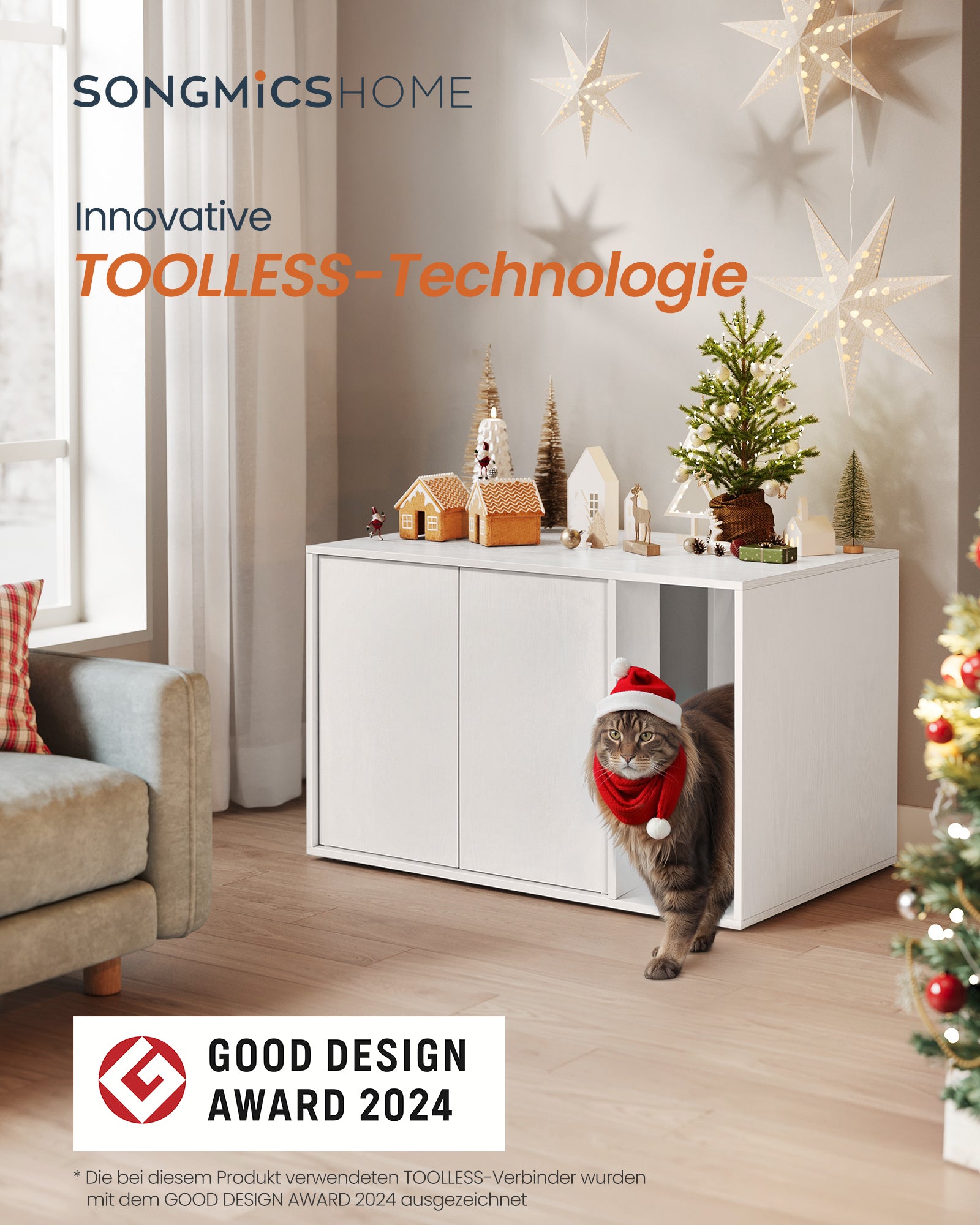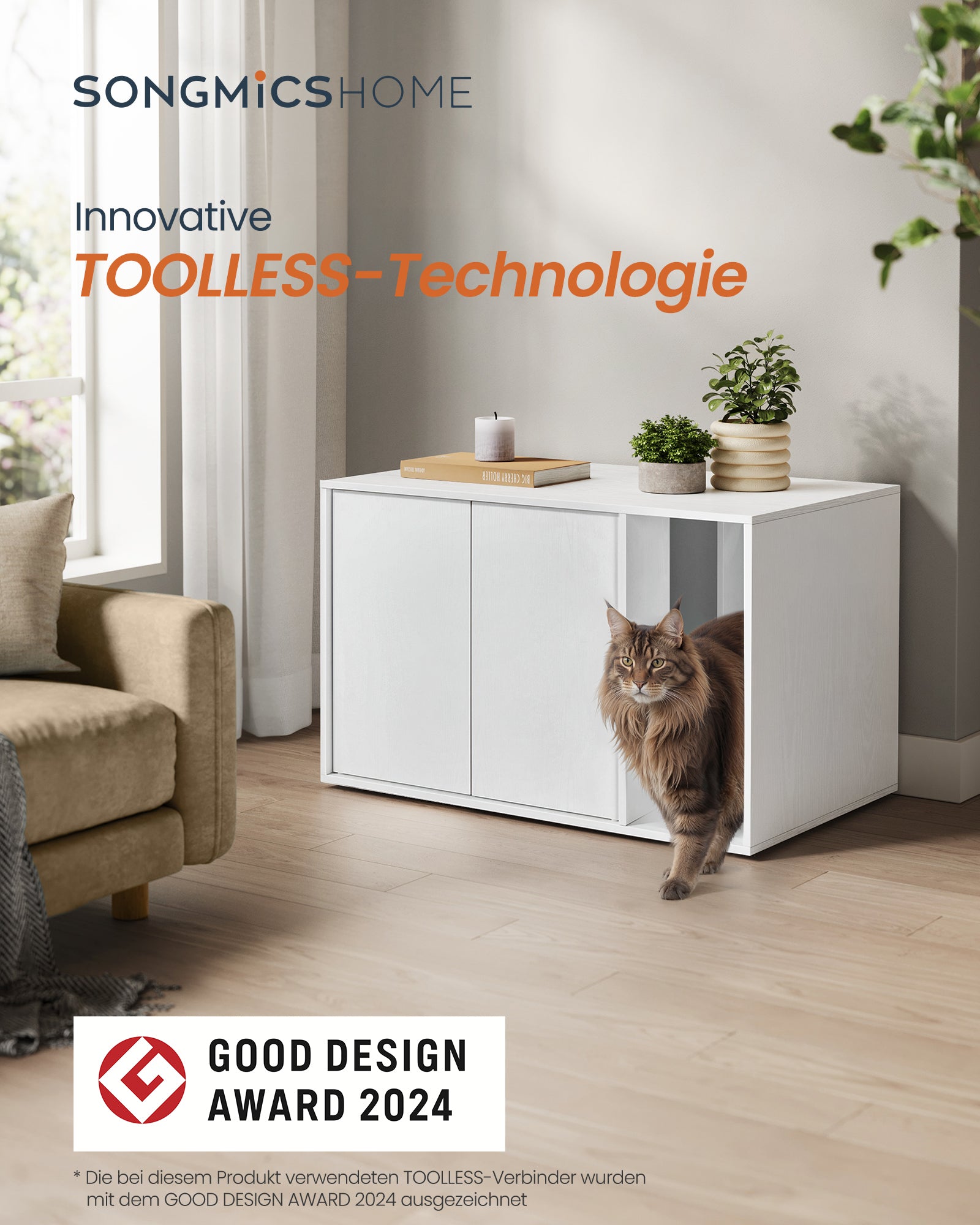 Denne katteboks kombinerer nette linjer med spillet mellem åbne og lukkede områder. Det balancerer visuel appel med funktionalitet og passer let ind i flere forskellige hjemmeindretninger.