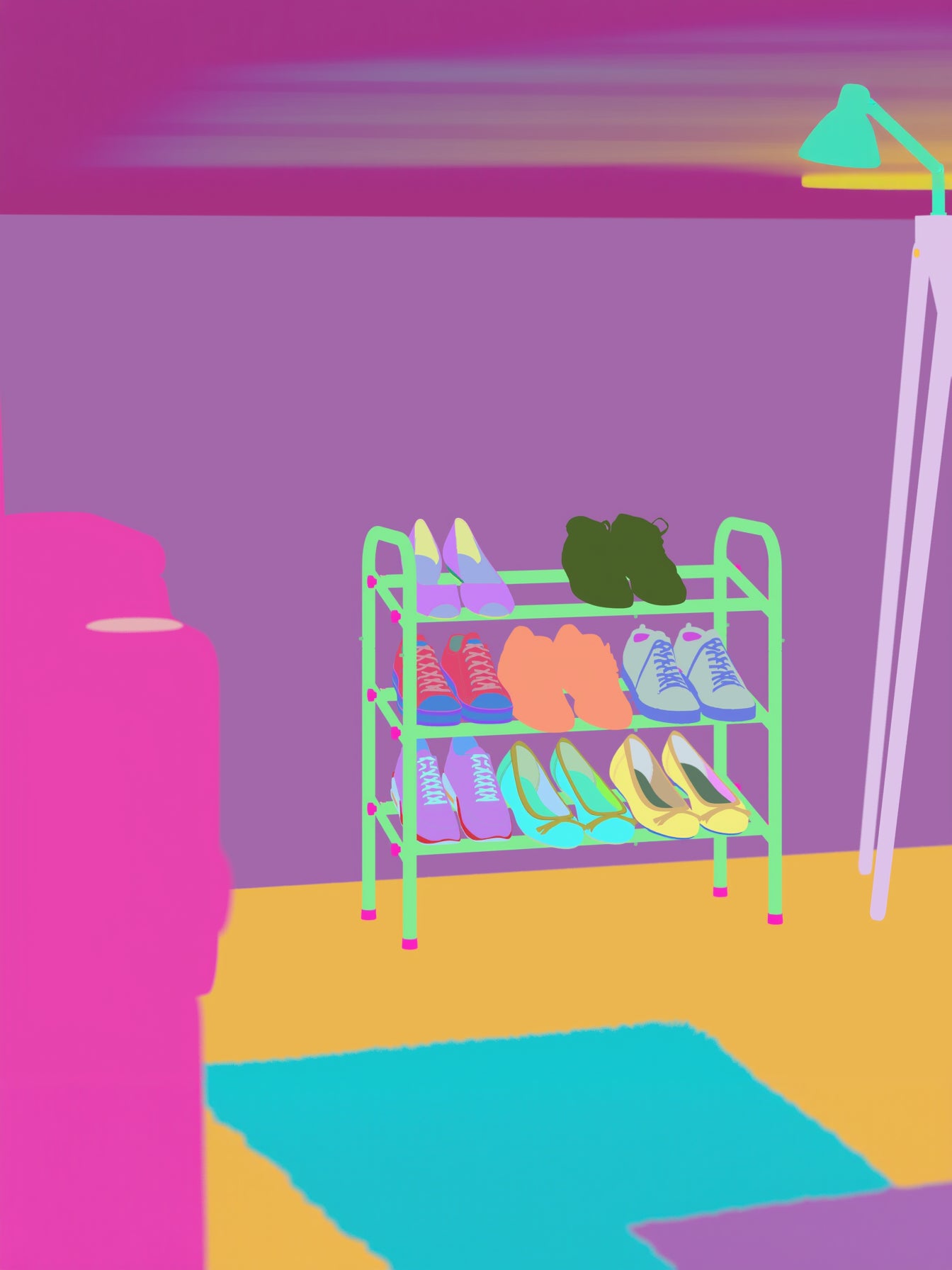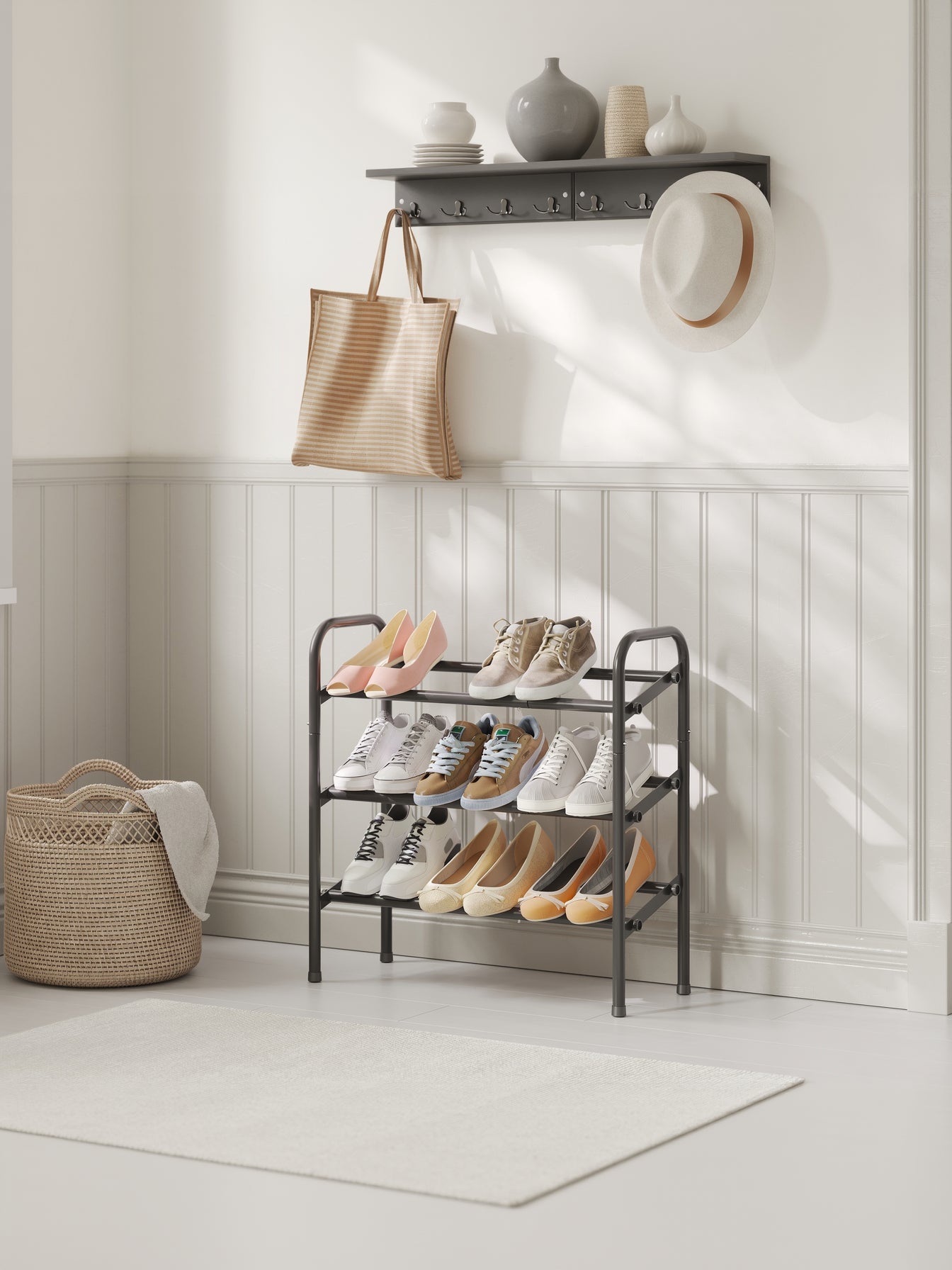 Den vinkelformede hylde holder skoene sikkert på plads og forhindrer især høje hæle i at glide ned.