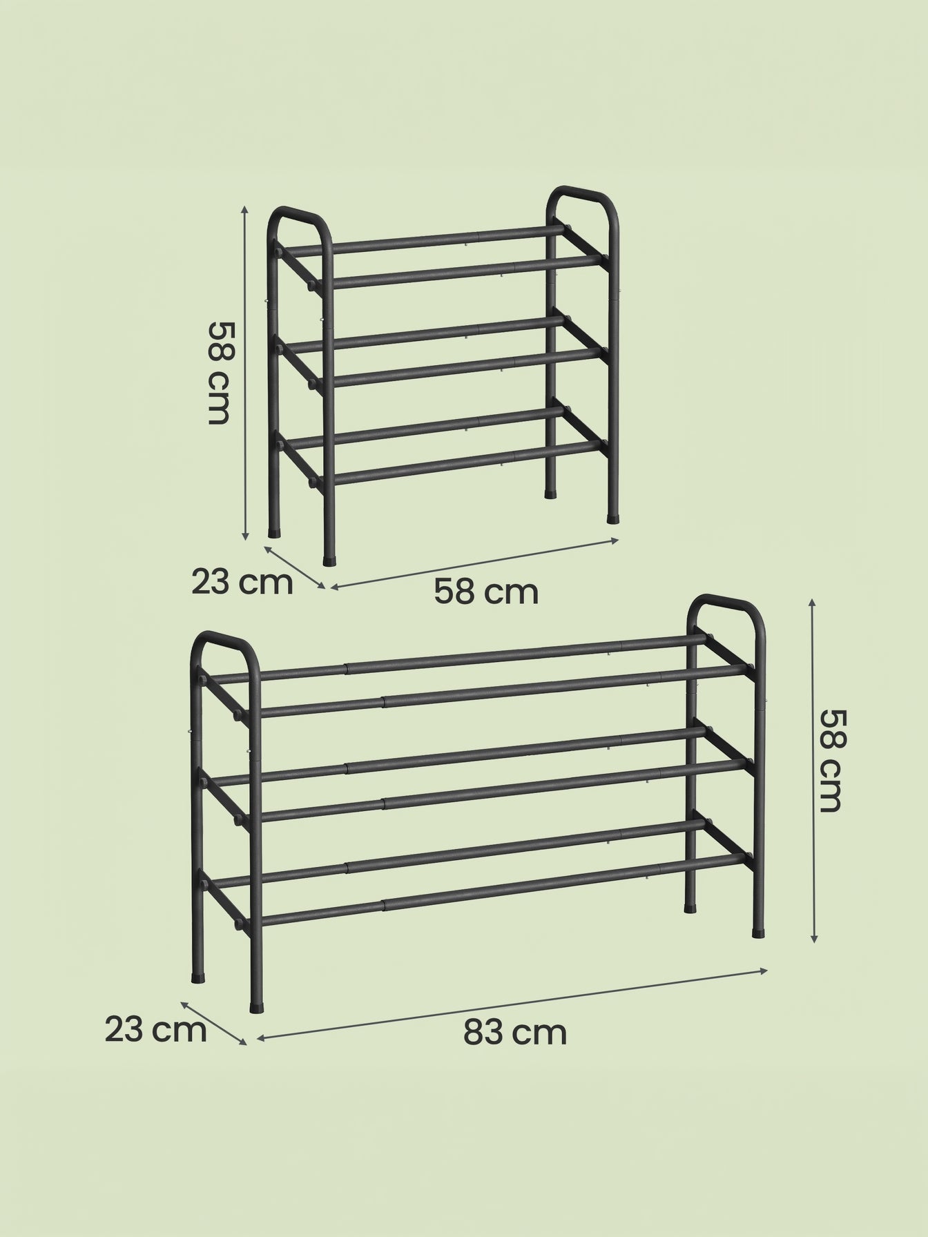 Skoreolen kan justeres i bredden fra 58 til 83 cm, så du får en fleksibel løsning, der passer perfekt til entréen, soveværelset, garagen eller små rum.