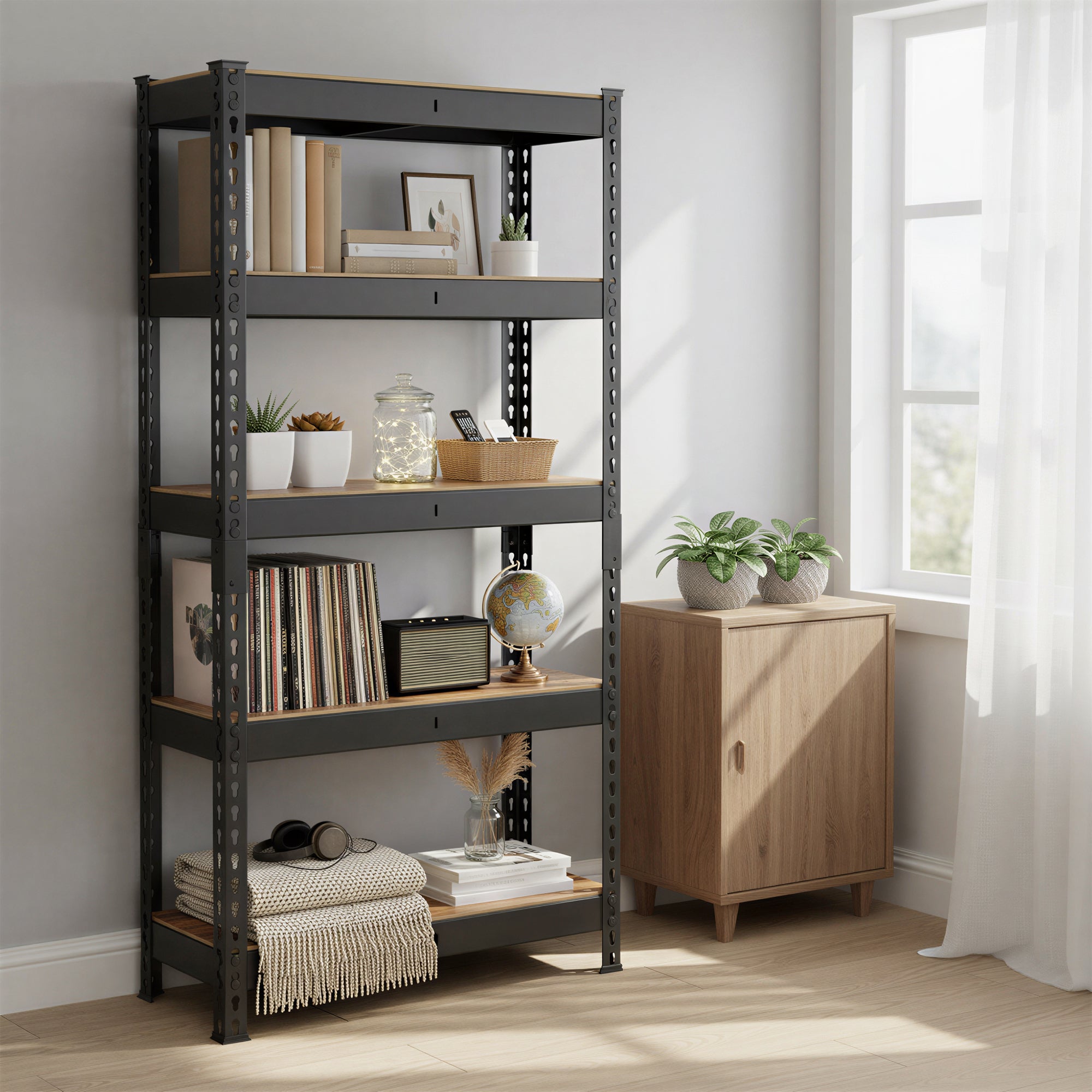 Værkstedsreolen er bygget med en robust stålramme og tykke MDF-hylder, der kan bære op til 175 kg pr. hylde. Forstærkede tværbjælker giver ekstra stabilitet.