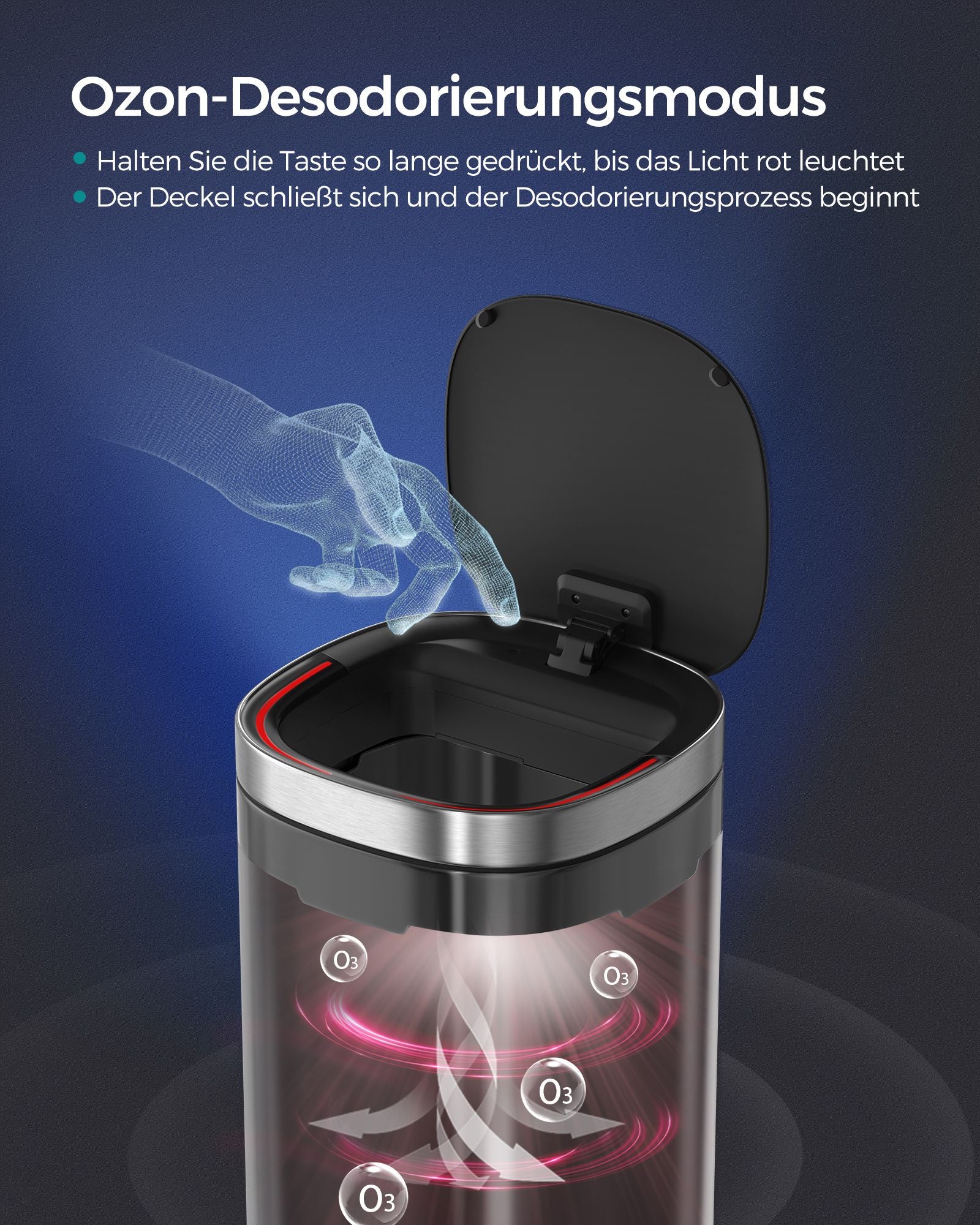 Med et enkelt tryk på knappen under låget aktiveres spandens ozon-lugtfjernelsestilstand. Denne proces tager 20 minutter og neutraliserer ubehagelige lugte effektivt, så dit køkken forbliver friskt og fri for generende lugte.