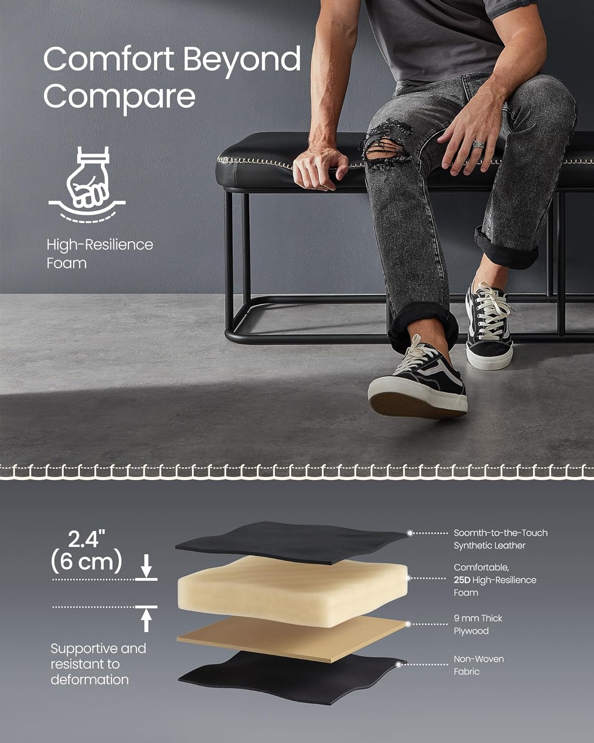 Ikke kun er denne bænk nem at samle, men den er også fremstillet af slidstærkt kunstlæder, der er en leg at passe på. Følg blot de klare instruktioner for at montere benene, og du er klar til brug. Investér i en indendørs bænk, der ikke kun er stilfuld, men også praktisk og let at vedligeholde.