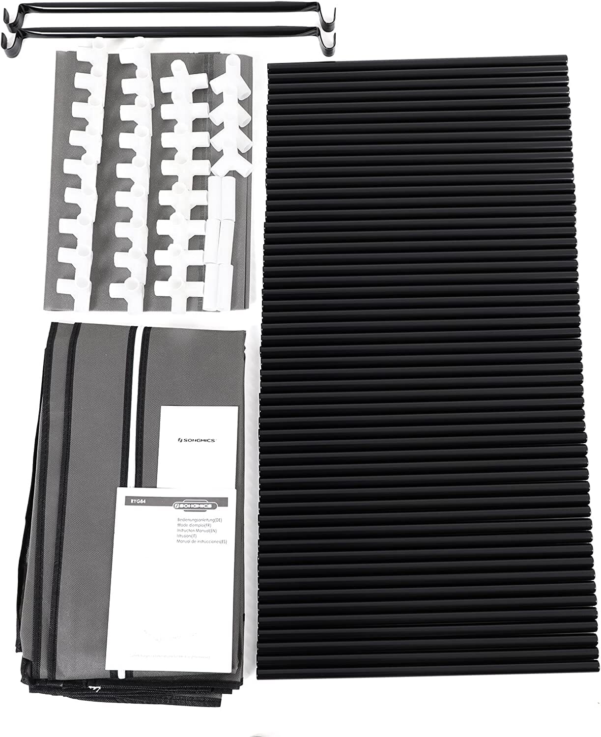 - Materiale: stof hylder (75g/ m2); stof betræk (75g/ m2); metalrør (dia. 15mm)