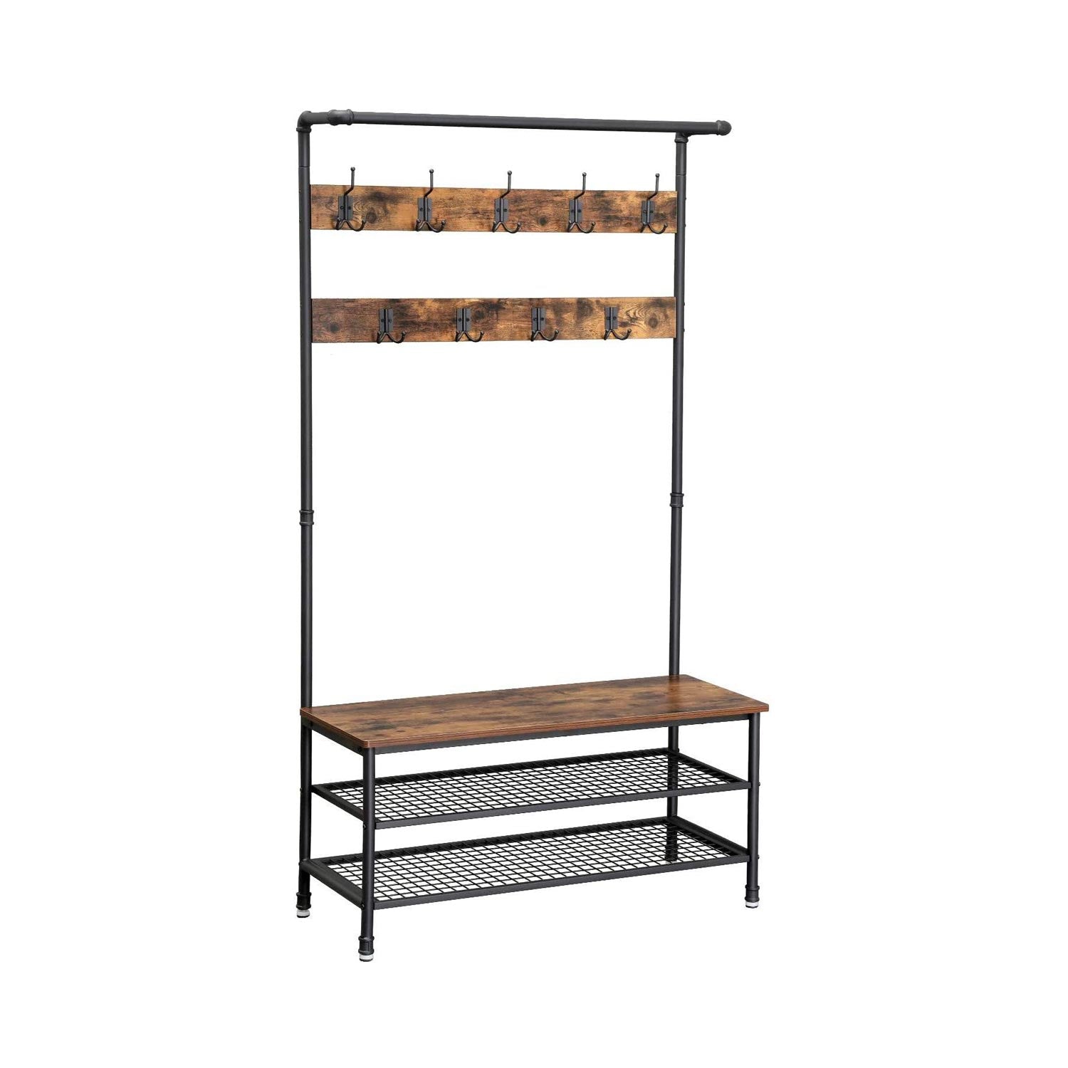 Robust og urbant design - Lionel-garderobestativ er en stilfuld og praktisk måde at opbevare tøj, hatte og sko på. Den er lavet med en metalramme, spånplade og laminatoverflade i mørkebrun træfarve. Benene kan justeres for at gøre stativet stabilt.