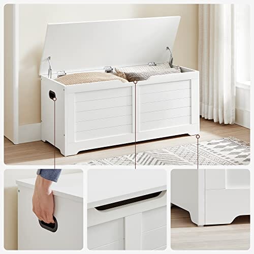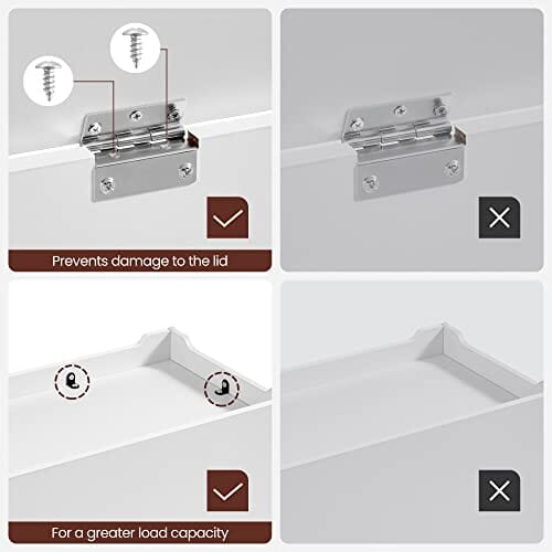 2 sikkerhedshængsler - Nyd maksimal sikkerhed med to robuste hængsler, der gør det muligt for låget på denne opbevaringsbænk at forblive stabilt åbent i 60° eller mindre vinkler, mens det lukkes, når der kun er 5 cm plads tilbage - ingen klemt fingre her!