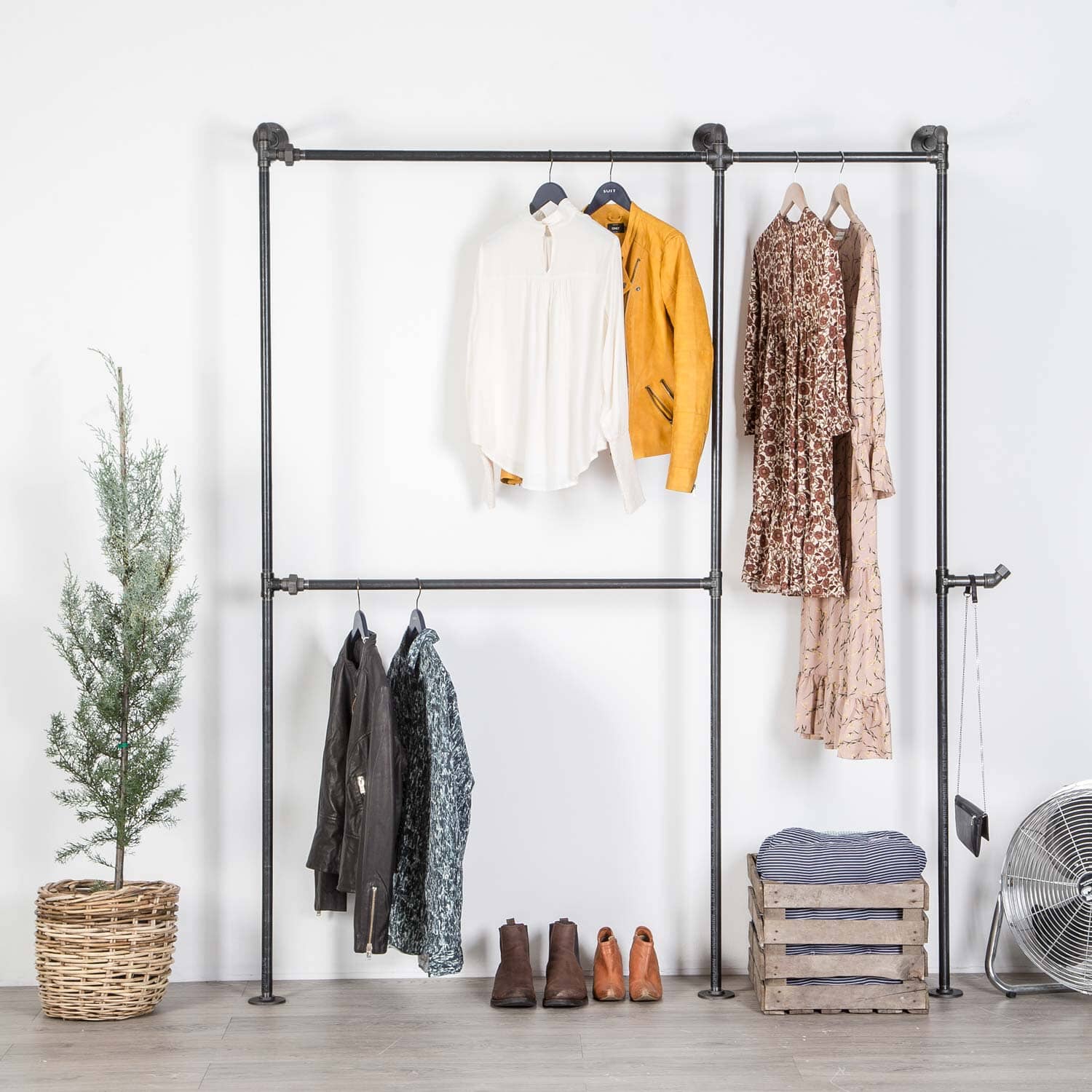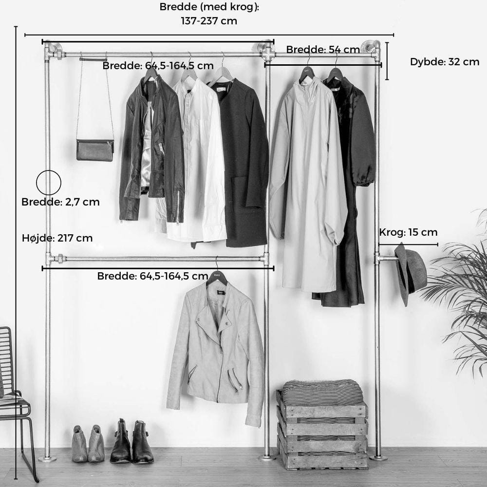 Kennedy tøjstativet minder om vores Alma tøjstativ, på nær at Kennedy tøjstativet er skruet fast i bagvæggen, og står solidt på sine 3 fødder på gulvet. Disse 3 fødder på gulvet skal naturligvis ikke skrues fast. Ingen af vores produkter skal skrues fast i gulvet. På Kennedy tøjstativet har du plads til det hele. I den ene side har plads til dit korte tøj såsom skjorter og bluser, og i modsatte side har du plads til lange jakker og kjoler.