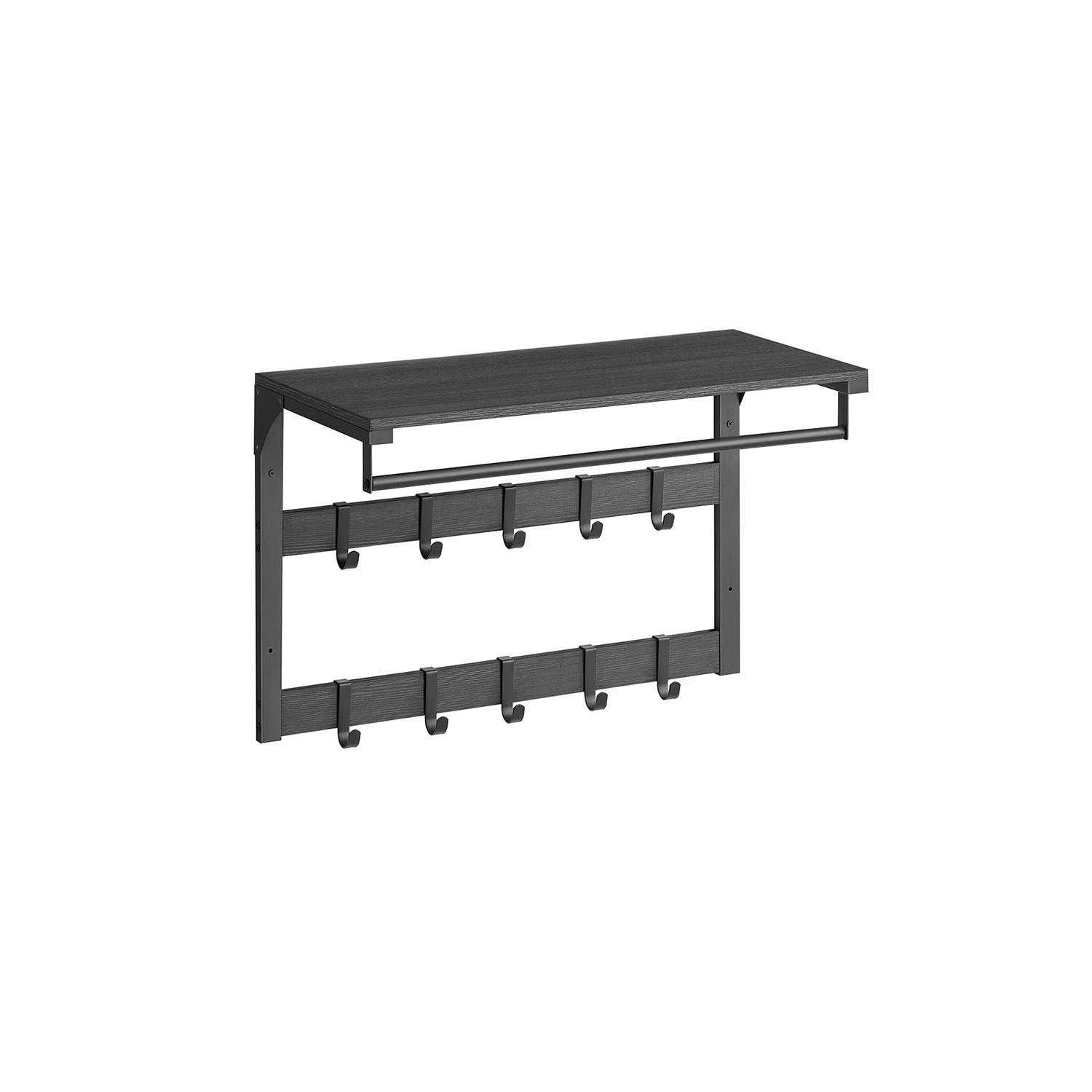 De 10 aftagelige kroge i 2 rækker på denne væghylde giver dig mulighed for at justere afstanden mellem dem for at hænge tasker, tøj og andre genstande i forskellige størrelser.