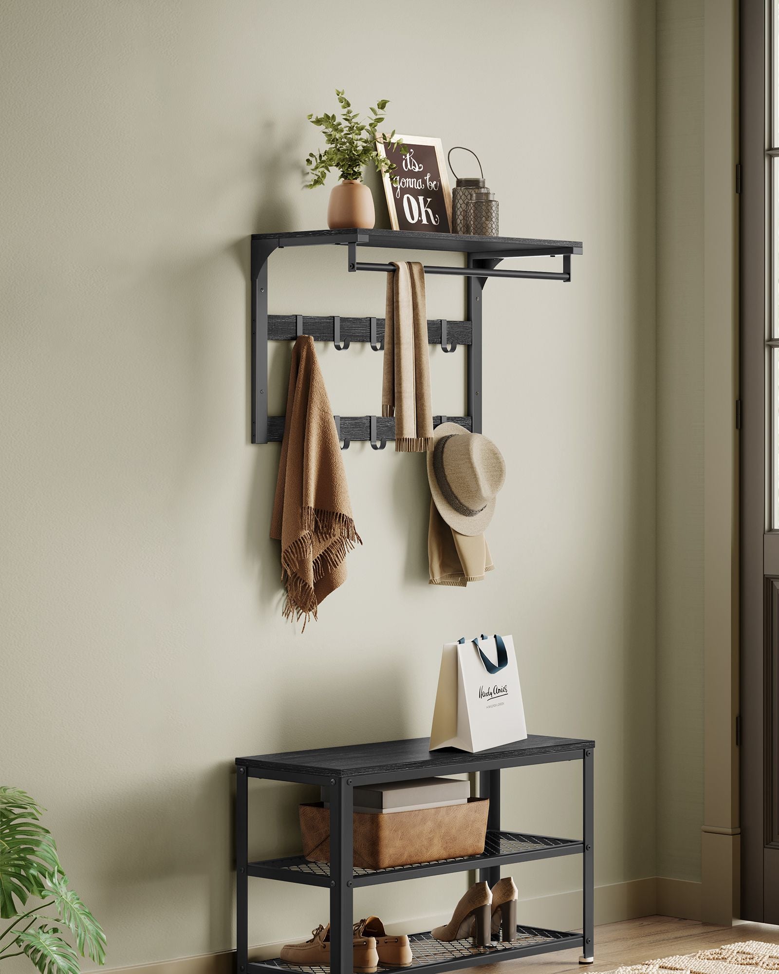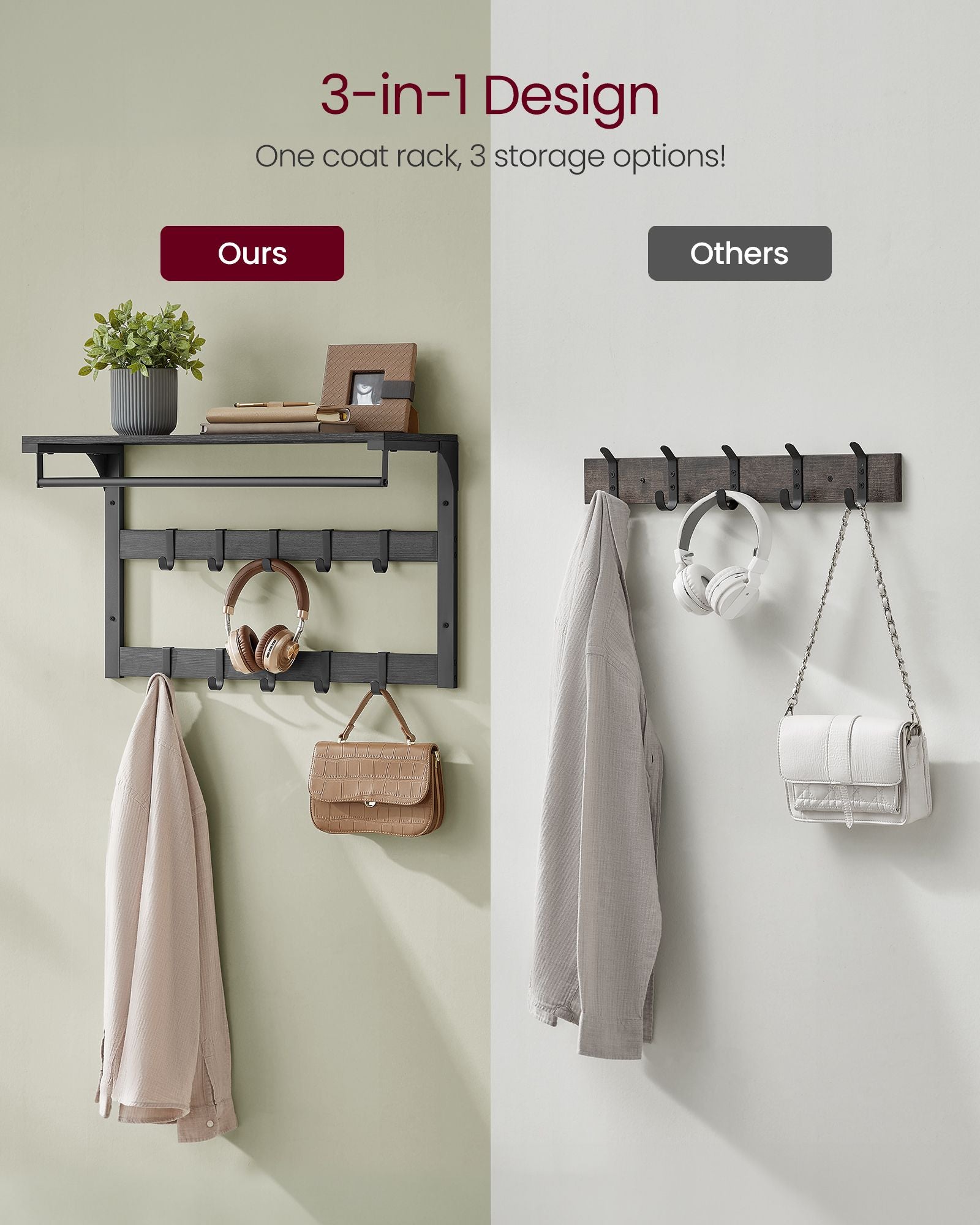 Med en hylde, aftagelige kroge og en hængestang, gør denne vægmonterede knagerække det muligt for dig at udstille, organisere og hænge på ét bekvemt sted.