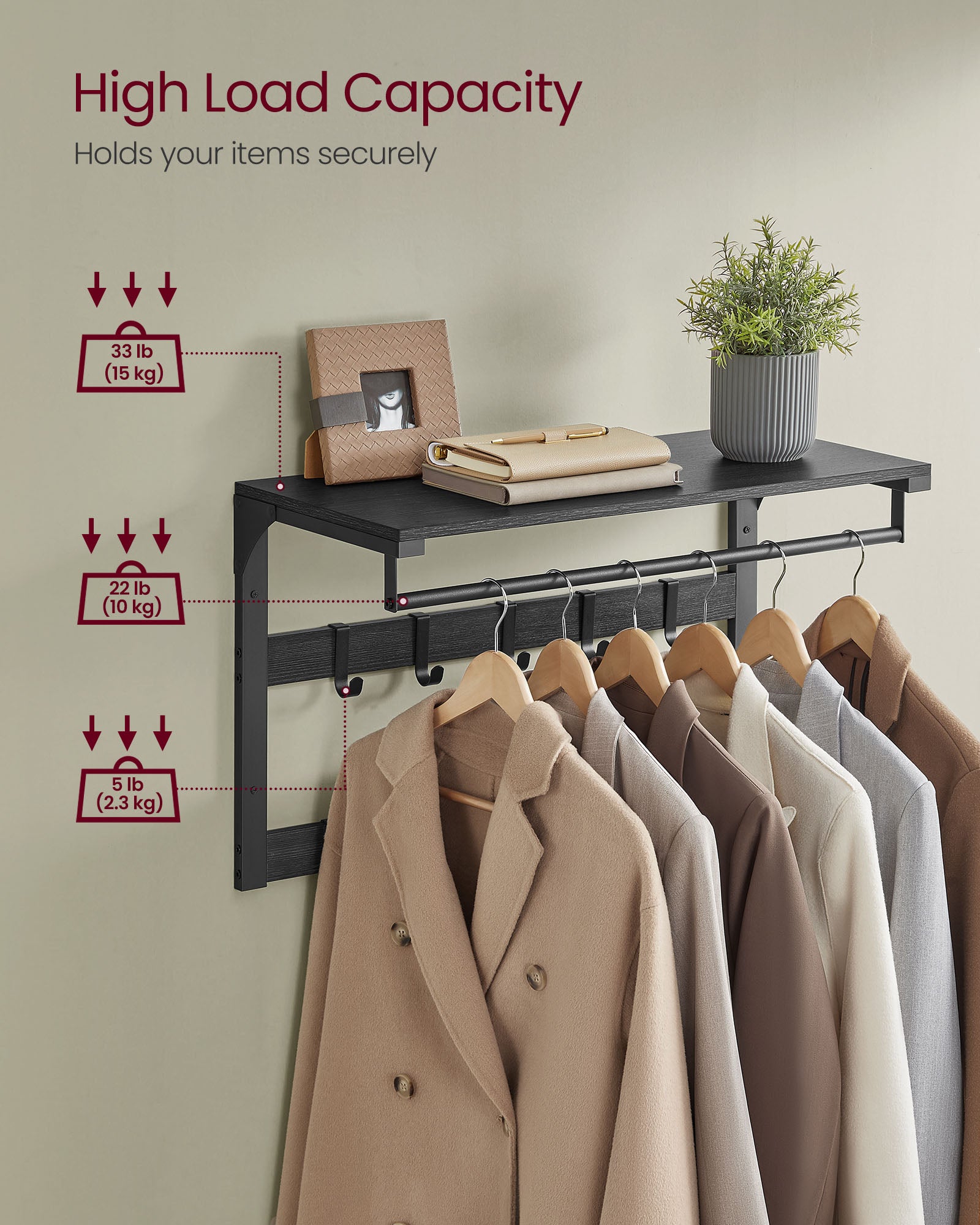 Fremstillet af stål og spånplade, kan knagerne med hylde bære op til 8,4 kg på hylden, 2,3 kg på hver krog, og 10 kg på hængestangen.